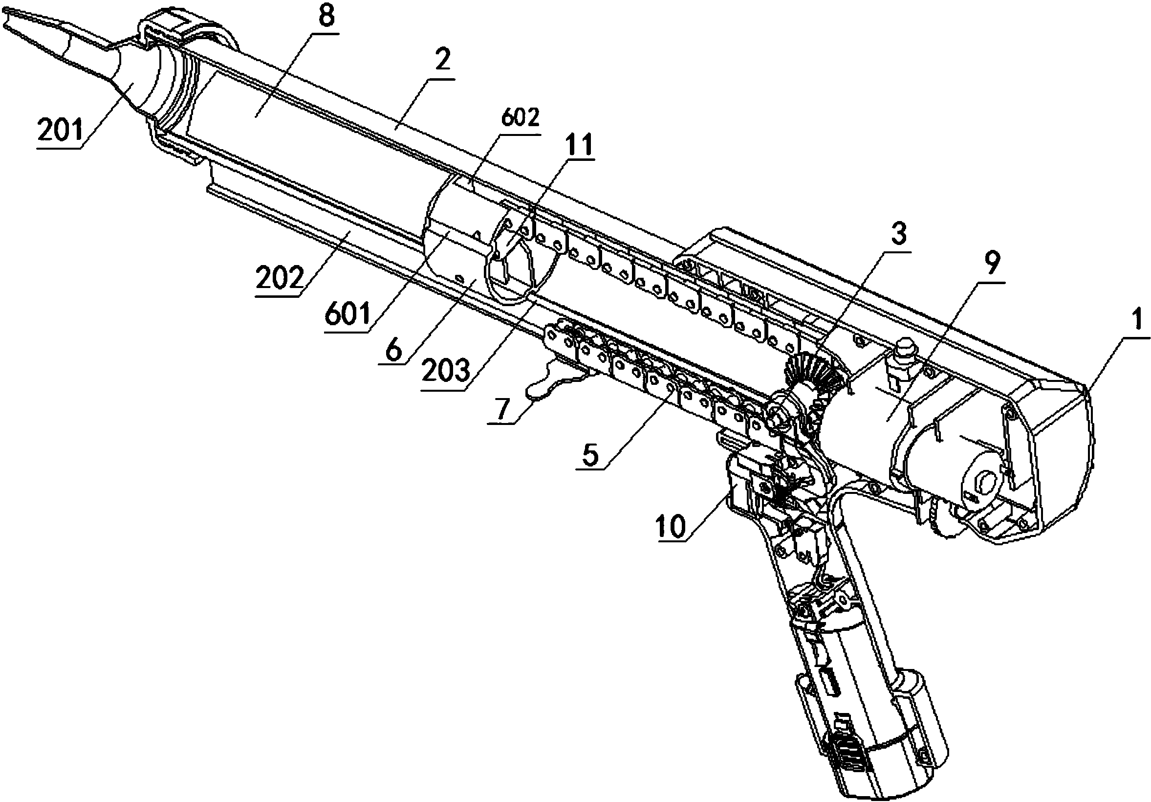 本实用新型提供了一种填缝工具及填缝枪,包括料筒和驱动机构,在驱动机构输出端设置有带柔性推杆的推料装置,且推料装置在驱动机构提供驱动力的情况下可推压料筒内的料体,以完成推压出料。采用本实用新型填缝工具进行推压出料,使得填缝工具在即停时不会继续流料,且无残料产生。而且本实用新型填缝工具体积小、长度短,尤其是在使用过程中,填缝工具的长度始终保持不变;使用方便,特别是在一些狭小空间、存在障碍物的空间、转角以及墙角处等受限场合,使用本实用新型填缝工具非常方便。