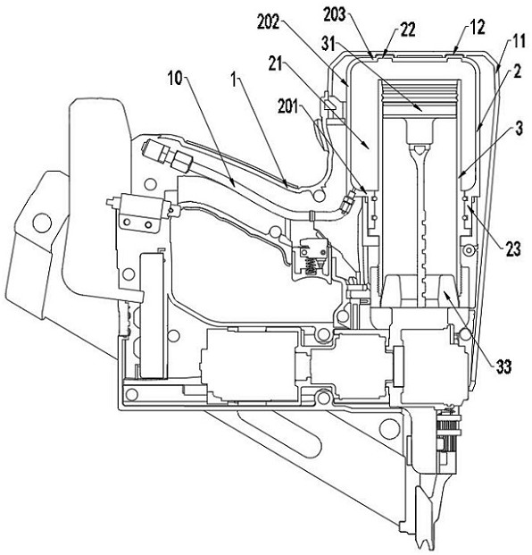 本实用新型涉及电动工具技术领域,为了解决现有技术中由于驱动工具储能室发生漏气而影响驱动工具正常使用的问题,提供了一种紧固件驱动工具,包括手柄和驱动部,驱动部包括气缸和气缸体,气缸内设置有做往复运动的活塞总成,气缸体内设有与气缸进气端连通的储能室;其中:气缸体偏心外套于气缸上,气缸体的底部设有径向朝外延伸的底壁,底壁位于气缸中部,底壁上设有围合气缸的圆筒状侧壁,侧壁沿轴向向上延伸并在侧壁上端设有盖住气缸的顶壁,气缸体内表面与气缸外表面围合成储能室。