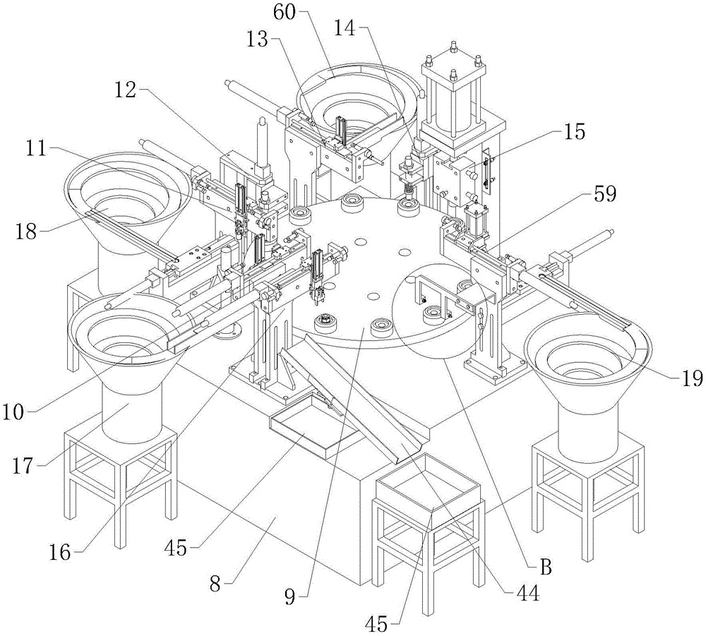 本实用新型涉及装配领域,具体涉及一种快插式接头组装设备,包括工作台、转盘、铜接头上料组件、密封圈上料组件、密封圈检测组件、锌套上料组件、锌套检测组件、铆压组件、塞盖上料组件和分选组件,工作台的旁侧设有铜接头上料器、密封圈上料器、锌套上料器和塞盖上料器,铜接头上料器、密封圈上料器、锌套上料器和塞盖上料器的出料端与铜接头上料组件、密封圈上料组件、锌套上料组件和塞盖上料组件一一对应,转盘的旁侧还设有用于检测铜接头的接近传感器,本实用新型的一种快插式接头组装设备,能够全自动的对快插式接头进行组装,同时能够自动检测并分离不良品,从而节约了人工成本,并且极大的提升了生产效率。