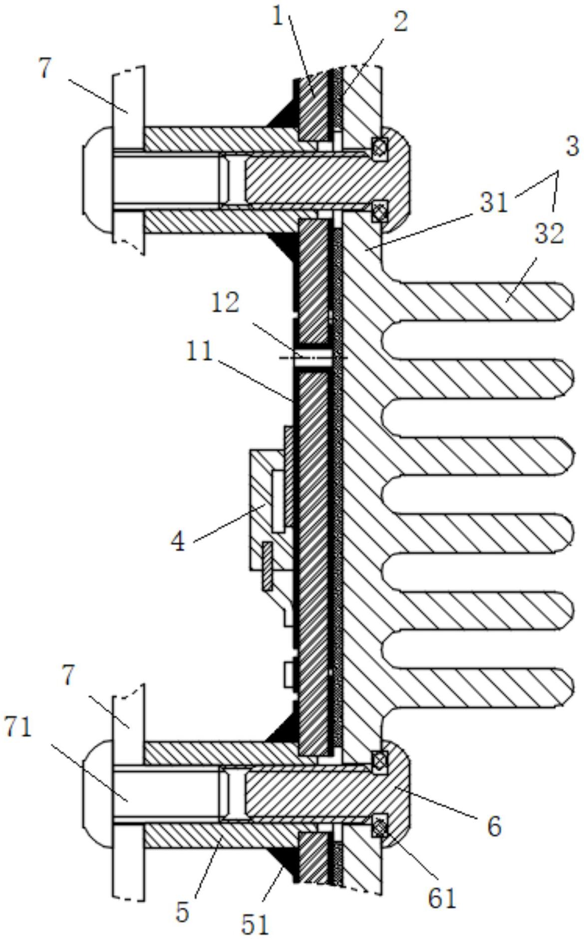 本实用新型涉及电路板技术领域,公开了一种印刷电路板结构。本实用新型的印刷电路板结构,包括:电路板基材、导热硅胶和散热器,电路板基材为非金属材质,外表面包覆有铜层,导热硅胶贴附在电路板基材的背面,散热器包括:基座和散热齿,多个散热齿间隔的设置在基座的一侧,基座的另一侧贴附在导热硅胶上,且与电路板基材连接。本实用新型的印刷电路板结构,电路板基材的背面设有导热硅胶和散热器,电子元器件贴装在电路板基材的正面,在工作时产生的热量经导热硅胶快速的传导给散热器,快速的散发,提高印刷电路板的散热效率,减小电子元器件的温升幅度,降低元件温漂,保证电子元器件正常工作;且电路板基材为非金属材质,成本较低。