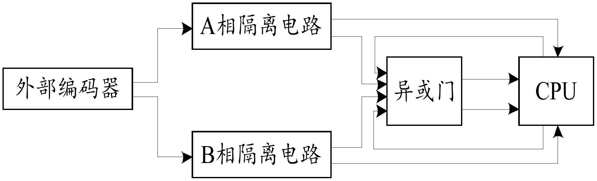 本实用新型公开了一种多通道PLC高速计数电路,涉及PLC计数领域,包括A相隔离电路、B相隔离电路、异或门和CPU;A相隔离电路的输入端接入外部编码器输出的A相脉冲信号、输出端分别连接异或门和CPU的输入端;B相隔离电路的输入端接入外部编码器输出的B相脉冲信号、输出端分别连接异或门和CPU的输入端;异或门的其余两个输入端还分别连接CPU的两个触发端,异或门的两个输出端分别连接CPU的两个时钟端,异或门在高速脉冲输入模式下用于确定同一时刻的两相脉冲信号的电平状态,通过设置CPU的触发端口来选择是使用普通输入或使用高速计数输入功能,不仅增加了高速计数的通道数,还为客户现场的使用提供了便利。