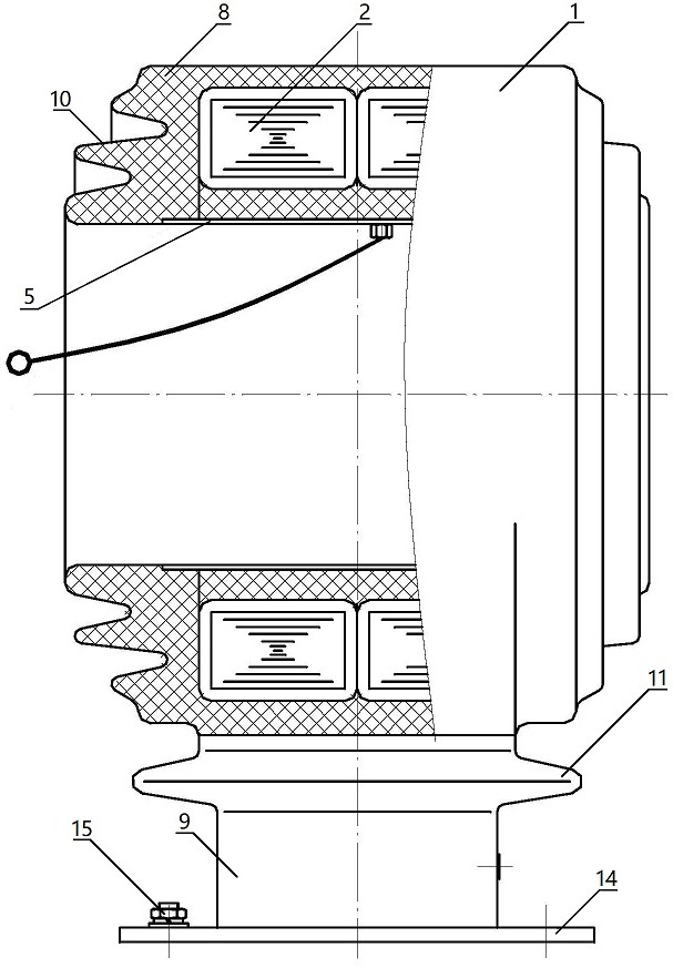 本实用新型涉及一种具有大爬电距离的支柱母线式电流互感器,包括由环氧树脂材料包封的铁心线圈,其特征在于该电流互感器至少包括一个用于设置环形铁心线圈的支架,环形铁心线圈设置在支架的弧形支撑面上,铁心线圈及支架的外表面采取屏蔽包扎并接地的结构,环形铁心线圈的内腔设置高压屏蔽网,用环氧树脂把铁心线圈、支架及高压屏蔽网浇注成一体,形成上部为包封铁心线圈和高压屏蔽网的环形绝缘体,下部为包封支架的绝缘支柱,上部环形绝缘体的两侧端面设有伞裙,下部绝缘支柱外部设有伞裙。其特点是:安装方便,占据空间小,加大了电流互感器的爬电距离,有效防止电流互感器沿外表面放电,该产品的污秽等级为Ⅱ‑Ⅲ级,满足在海上船舶中使用的各项技术和环境参数标准,主绝缘>10mm,保证有足够的耐压强度,爬电距离>300mm,保证有足够的外绝缘,大大提高了产品的稳定性及可靠性,可以在较高湿度环境条件下安全使用。