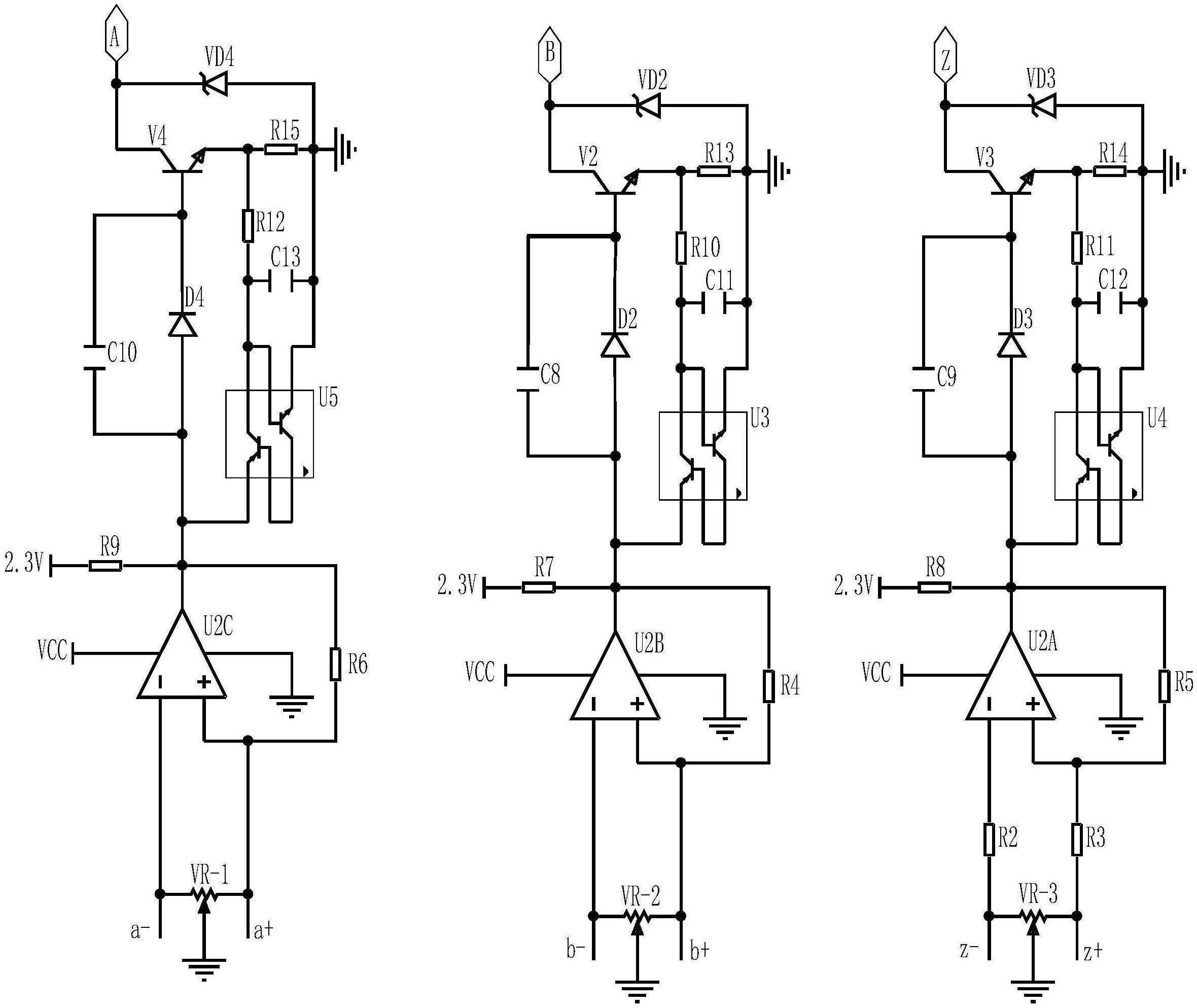 本实用涉及一种编码器的电路结构,包括电源电路,光电转换电路,A、B和Z路信号处理电路,光电转换电路的三路输出分别接入A、B和Z路信号处理电路的输入端,A、B和Z路信号处理电路采用相同的电路结构,A路信号处理电路包括运放,A路信号处理电路的输入端a‑、a+分别接至运放的反相端和同相端,运放的输出端经上拉电阻连接至第一直流电源,运放的输出端接至第一三极管的基极,第一三极管的集电极引出A相输出信号,第一三极管的发射极经采样电阻连接至地,运放的输出接至触发导通组件的输入端,触发导通组件的第一输出端经电阻接至采样电阻的连接端,触发导通组件的第二输出端接至地。本实用具有结构简单,保护可靠的特点。