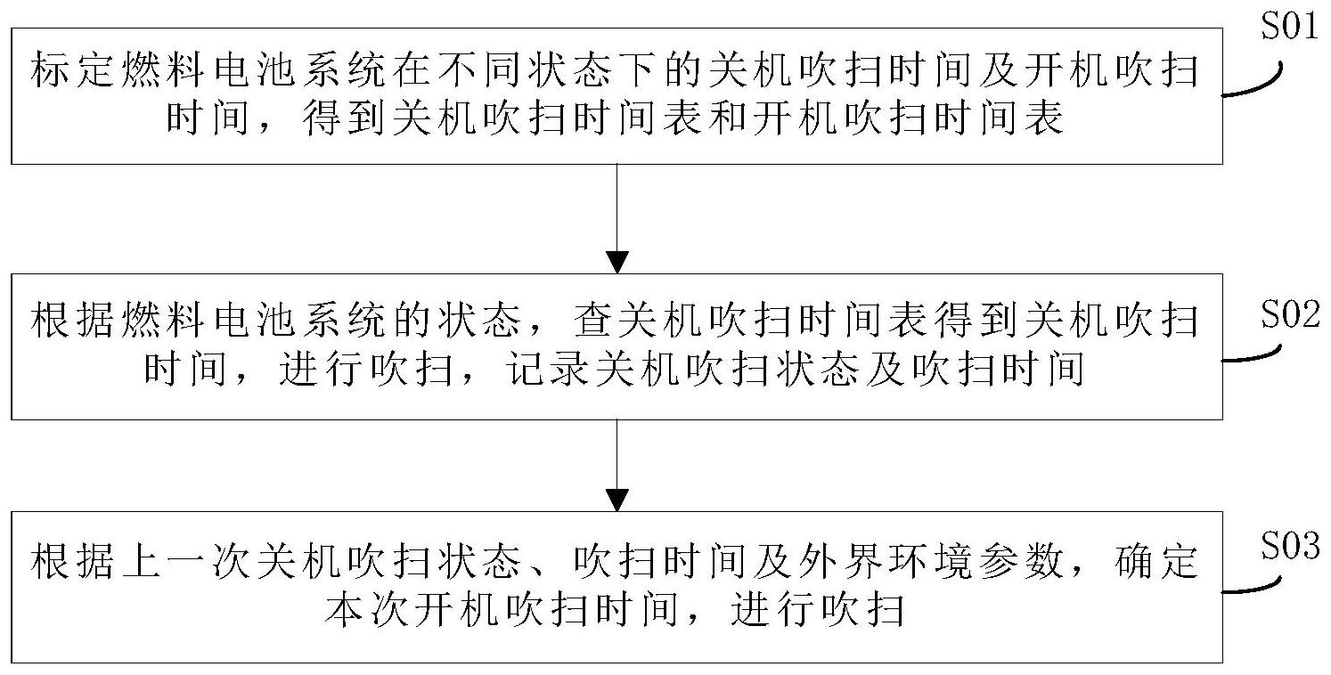 本发明公开了一种燃料电池系统的开关机吹扫控制方法,包括以下步骤:标定燃料电池系统在不同状态下的关机吹扫时间及开机吹扫时间,得到关机吹扫时间表和开机吹扫时间表;根据燃料电池系统的状态,查关机吹扫时间表得到关机吹扫时间,进行吹扫,记录关机吹扫状态及吹扫时间;根据上一次关机吹扫状态、吹扫时间及外界环境参数,确定本次开机吹扫时间,进行吹扫。通过台架标定数据查表及外界环境温度、湿度信息、上次关机时间及关机状态等,调整燃料电池系统开机吹扫时间及流量、流速等,确保燃料电池系统开机后是出于最佳状态。