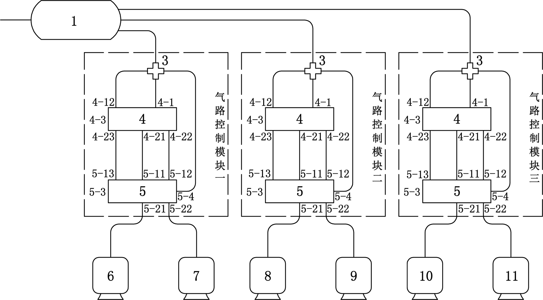 本发明涉及一种客车车身升降控制系统,包括储气筒和三个气路控制模块,三个气路控制模块分别控制前轴左右气囊、后轴左侧前后气囊和后轴右侧前后气囊;气路控制模块包括四通接头、限位高度阀、电控举升阀,限位高度阀包括两个进气口、三个出气口和一个排气口,电控举升阀包括三个进气口、两个出气口、控制口和排气口;储气筒连接至四通接头,四通接头分别与限位高度阀的两个进气口和电控举升阀控制口连接,限位高度阀的三个出气口分别与电控举升阀的三个进气口连接,电控举升阀的两个出气口分别和两个气囊相连。本发明利用限位高度阀和电控举升阀等少量部件组成客车车身升降控制系统,实现车身高度的自动和手动控制,系统简单,成本低。