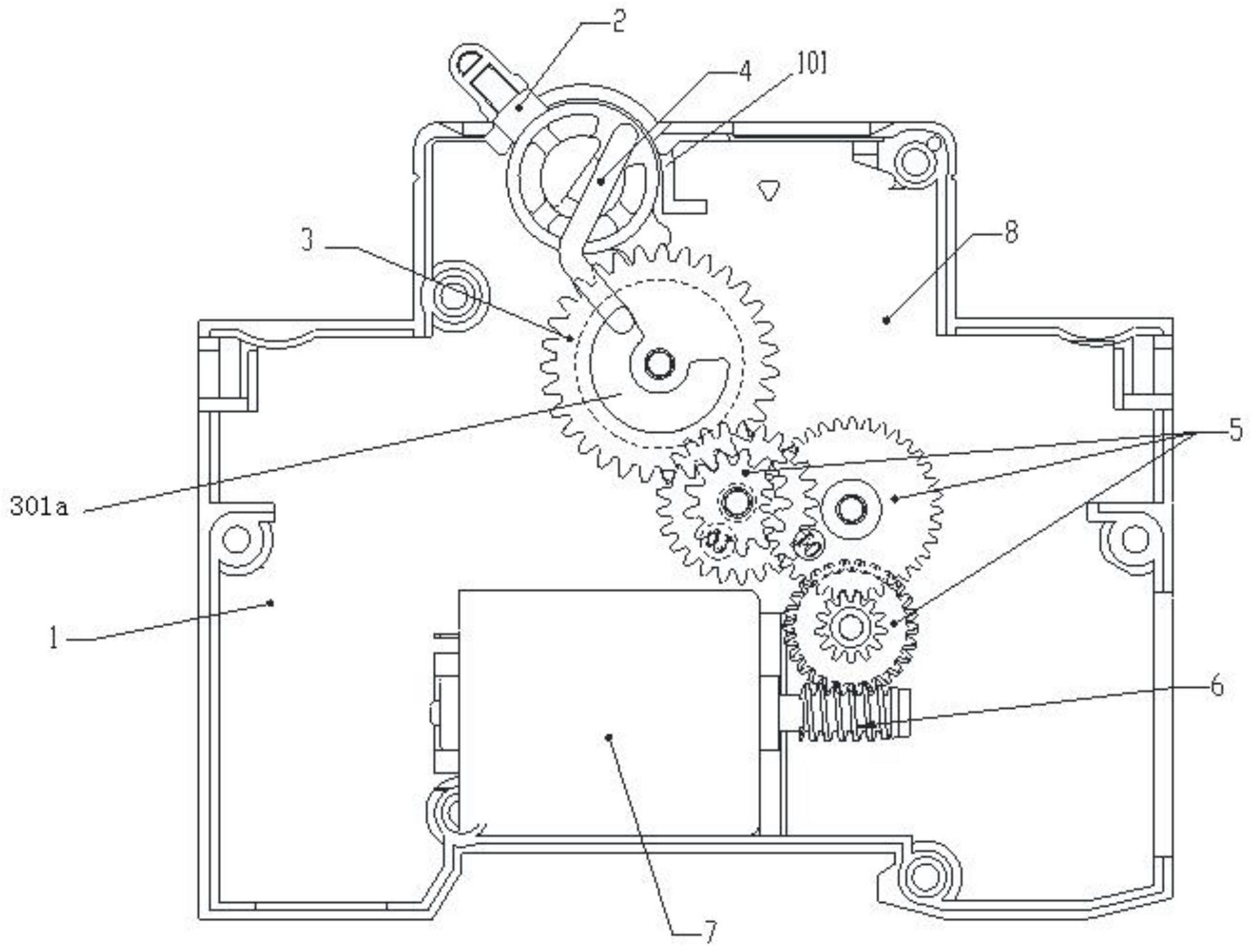 一种电动操作装置驱动传动机构,它包括外壳(1),电操手柄(2)装在所述外壳(1)的手柄安装槽(101)内,所述外壳(1)内腔中装有驱动齿轮(3),其特征在于:所述驱动齿轮(3)上设有槽(301),连杆(4)一端装在所述槽(301)内,另一端装在所述电操手柄(2)上,所述驱动齿轮(3)逆时针单向转动过程中通过连杆(4)带动所述电操手柄(2)来回转动。本电动操作装置内部零件排布紧凑,空间体积小;当驱动电机旋转至使断路器手柄处于中间位置的时候出现故障时断路器合闸不到位,可以通过手动操作将手柄扳到合闸位置而为用户供电,消除安全隐患。同时利用电机带动驱动齿轮360度旋转带动连杆从而推动电操手柄实现远程分合闸,无需脱扣机构就能实现远程分闸。