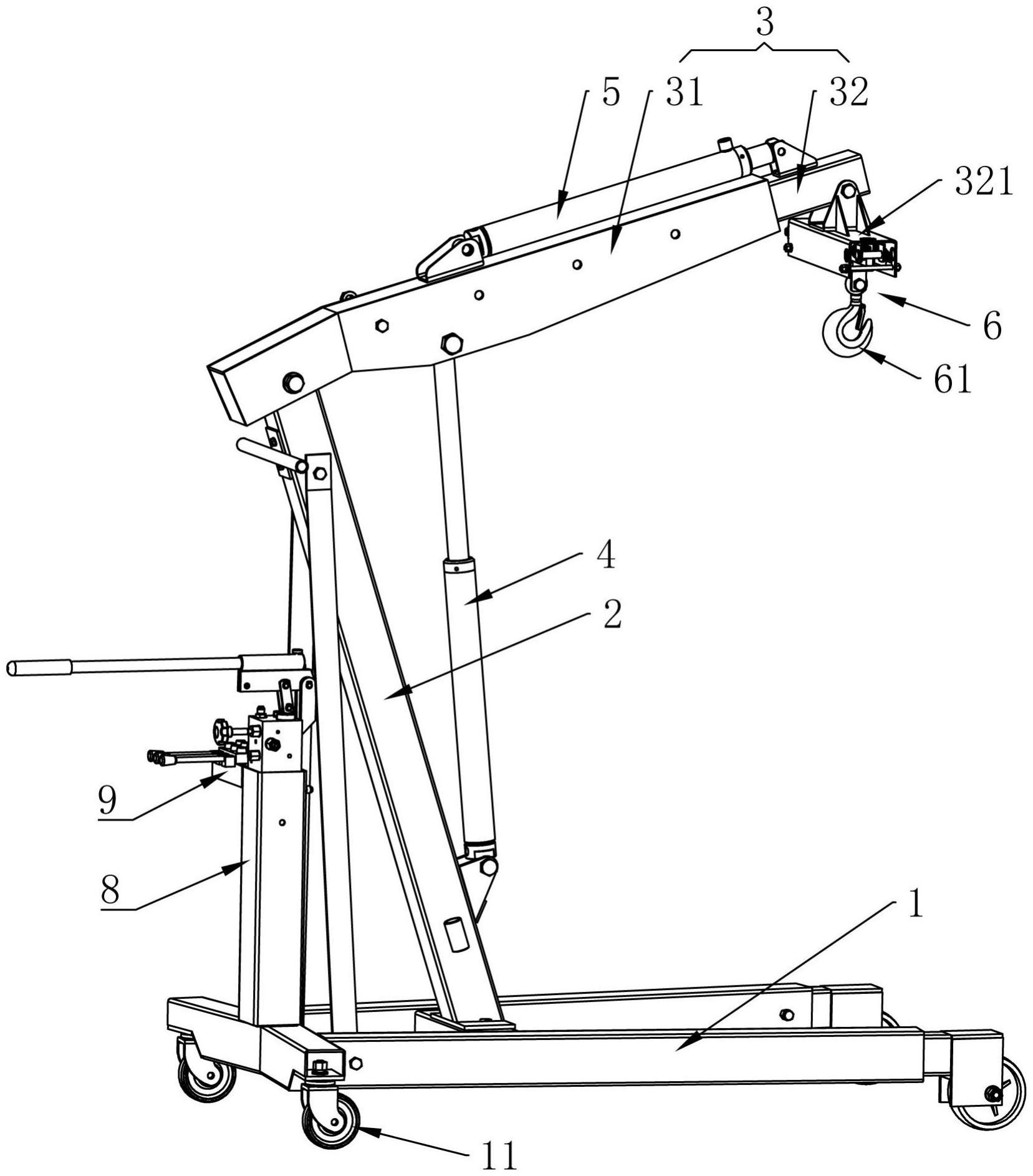 本实用新型公开的一种吊机,包括底座总成、立柱总成、悬臂总成及举升油缸,立柱总成设置于底座总成上;悬臂总成包括固定悬臂和伸缩悬臂,固定悬臂铰接于立柱总成的顶部,举升油缸铰接于固定悬臂与立柱总成之间;固定悬臂和伸缩悬臂相互套接且伸缩配合,固定悬臂设置有与伸缩悬臂传动连接的纵向油缸,纵向油缸用于驱动伸缩悬臂相对于固定悬臂沿纵向滑动;伸缩悬臂的端部设置有吊运组件,伸缩悬臂设置有与吊运组件传动连接的横向油缸,横向油缸用于驱动吊运组件相对于伸缩悬臂沿横向滑动。本实用新型结构简单合理,能够有效增大工件的移动范围,使用方便,有利于满足实际使用需求。