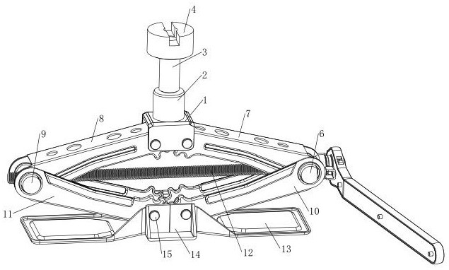 本实用新型及一种车用千斤顶,包括横向底座、竖向底座组件、第一下支撑臂、第二下支撑臂、右牙螺母、左牙螺母、丝杠、第一上支撑臂、第二上支撑臂及支撑座;竖向底座组件安装在横向底座的中部,竖向底座组件与横向底座配合形成“十”字形;第一下支撑臂的下端部及第二下支撑臂的下端部分别与横向底座转动连接;右牙螺母套在丝杠的右部,左牙螺母套在丝杠的左部,第一下支撑臂的上端部与右牙螺母转动连接,第二下支撑臂的上端部与左牙螺母转动连接;第一上支撑臂的下端部与右牙螺母转动连接,第二上支撑臂的下端部与左牙螺母转动连接,第一上支撑臂的上端部及第二上支撑臂的上端部分别与支撑座转动连接。其具有千斤顶不会侧倾等优点。