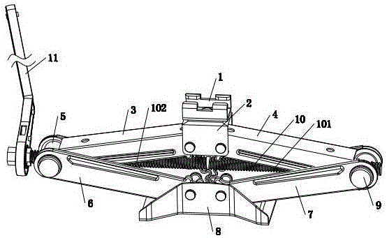 本实用新型涉及一种快速千斤顶,特点是包括底座,第一下支撑臂、第二下支撑臂、左牙螺母、右牙螺母、螺杆、第一上支撑臂、第二上支撑臂、顶头座;第一下支撑臂的一端及第二下支撑臂的一端分别转动的设在底座上;螺杆的左右两侧分别设有左螺纹及右螺纹,左牙螺母套设在螺杆的左侧并螺纹配合,右牙螺母套设在螺杆的右侧并螺纹配合,第一下支撑臂的另一端与左牙螺母转动连接,第二下支撑臂的另一端与右牙螺母转动连接;第一上支撑臂的一端与左牙螺母转动连接,另一端与顶头座转动连接,所述第二上支撑臂的一端与右牙螺母转动连接,另一端与顶头座转动连接。其优点为:能较快的将在顶头座升起或降低,并减少轴承座,防止在操作时轴承座承受过大的压力,从而损坏,使快速千斤顶失效,在操作方便,受力均匀,使用寿命长。
