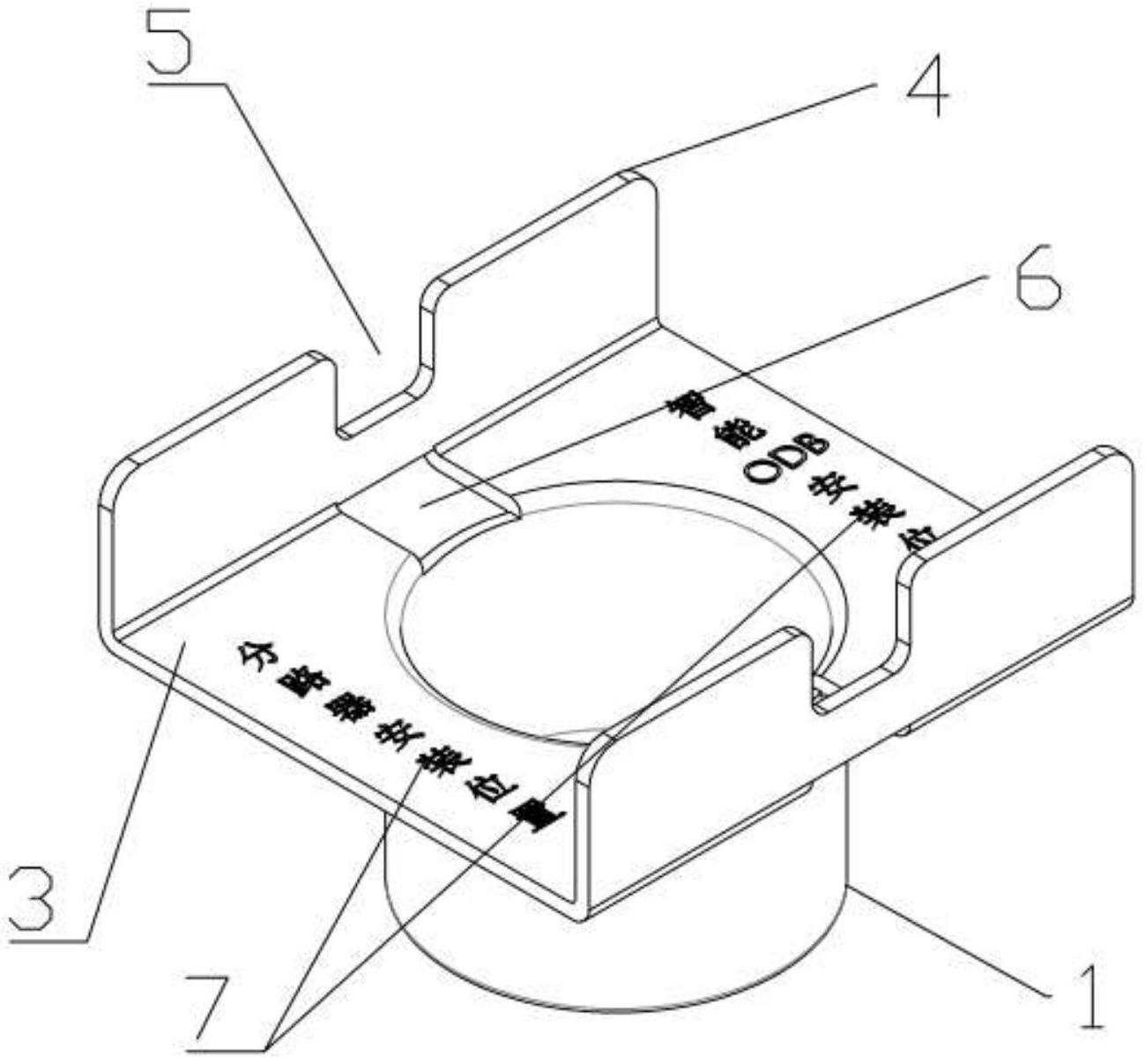 本实用新型公开了一种用于固定盒式光分及智能ODB的装置及其分纤箱,旨在提供一种固定盒式光分路器及其光纤的装置及其分纤箱。包括底座,底座中空式设计,底座的底面设有若干安装孔,底座的顶面开口式设计,底座的顶面配合连接有安装面板,安装面板的两侧设有固定板,固定板上设有固定凹槽,安装面板上配合固定凹槽设有连接孔。所述底座的形状为圆柱体,底座的侧面设有若干防滑凹槽。所述安装孔包括一个第一安装孔和若干第二安装孔,第二安装孔以第一安装孔为中心周向设置。所述连接孔相对设置。所述连接孔的深度至少为安装面板的厚度。本实用新型既可以固定盒式光分路器,又可以优化盒式光分路器中的光纤在分纤箱内的布局。