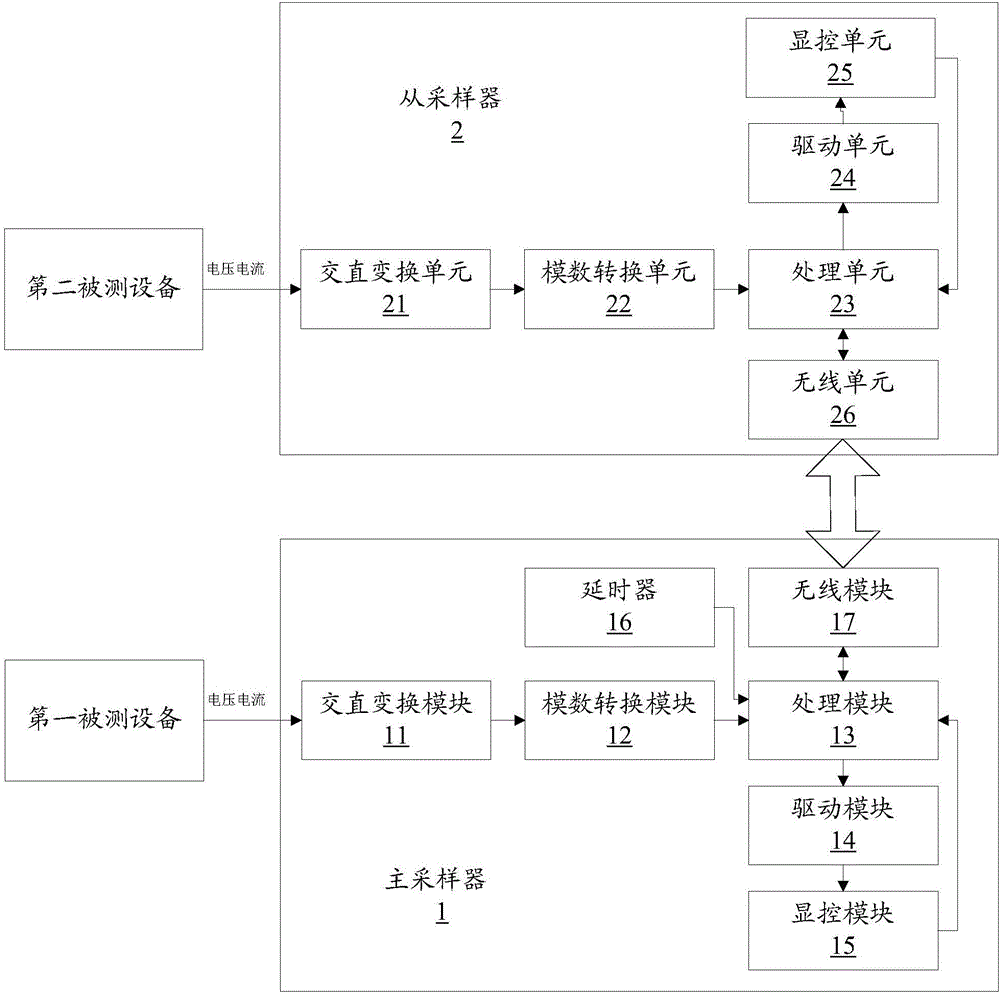 本实用新型适用于测试仪器技术领域,提供一种分布式同步采样测量系统,包括主采样器和从采样器,所述主采样器包括顺次连接的交流变换模块、模数转换模块、处理模块、驱动模块和显控模块,所述处理模块还连接有延时器和无线模块,所述从采样器包括顺次连接的交流变换单元、模数转换单元、处理单元、驱动单元和显控单元,所述处理单元还连接有无线单元,所述无线模块和无线单元网络连接。本实用新型主从采样器之间,采用无线同步技术进行分布式同步采样和测量,采集到的电压、电流无需使用线缆将传输至同一处进行集中测量,只需在同一时刻对它们进行同步采样即可实现对电压电流幅值和它们之间的相位差进行测量,测量准确度高。