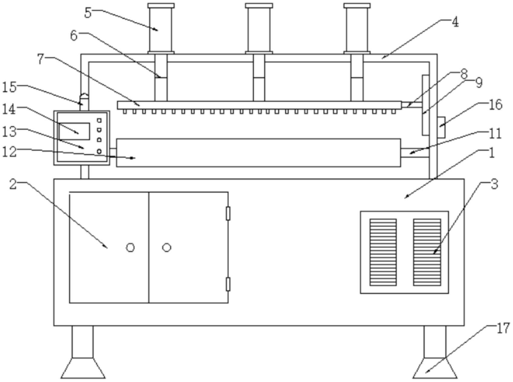 本实用新型公开了一种具有限位固定机构的锡条成型装置,包括主体,主体一侧的一端通过铰链铰接有铝合金门,主体一侧的另一端固定安装有排气窗,主体的顶部与支撑架的底部固定连接,支撑架的顶部固定安装有三个分布均匀的电动液压缸,三个电动液压缸的底部均传动连接有液压杆,三个液压杆的一端均穿过支撑架的顶部与第一锡条浇筑模型的顶部固定连接,本实用新型一种具有限位固定机构的锡条成型装置,可以通过限位箱对第一锡条浇筑模型进行准确的限位,可以更好的进行锡条的浇筑工作,工作人员只需通过控制按钮便可完成锡条浇筑工作,节省了人力,提高了工作的效率,装置工作时变得更加的稳定。