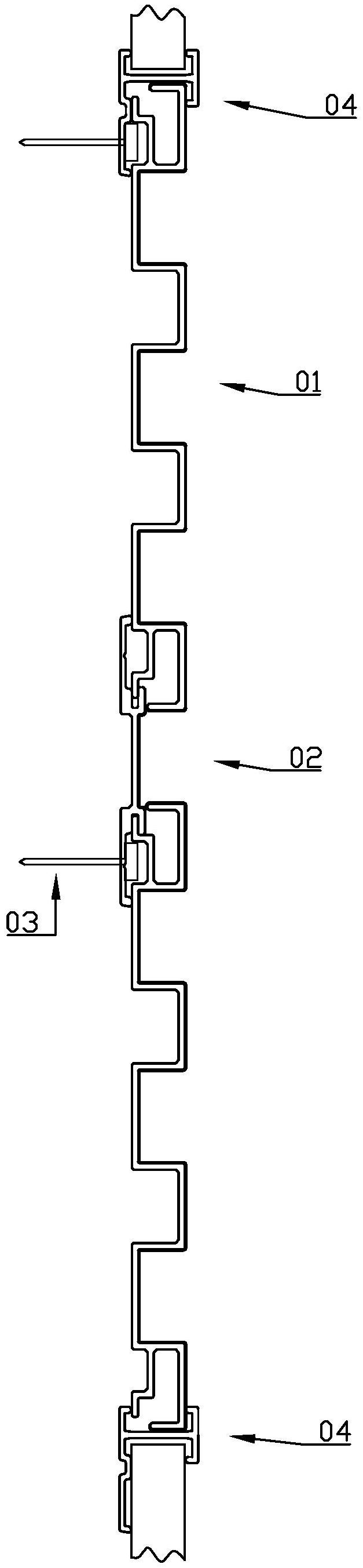 本实用新型公开一种铝型材板,其只具有母槽,提高安装效率。一种铝型材板,包括主板,主板的两端设有母槽,母槽包括弯折形成Z字形的插板,以及插板的上延伸出与插板相对的压板,插板包括第一板体,第一板体向下延伸弯折形成平行于第一板体的第二板体,压板包括第一板体向上延伸弯折平行于第一板体的第三板体,第三板体的边沿向下延伸弯折形成第四板体;两相邻的主板通过第一连接件相拼接组合;第一连接件包括第五板体,第五板体的两端设有卡槽,卡槽包括第五板体向上延伸弯折的第六板体,以及第五板体向下延伸弯折形成平行与第六板体的第七板体,第七板体向外延伸有固定板,固定板的上表面凹陷形成凹坑。