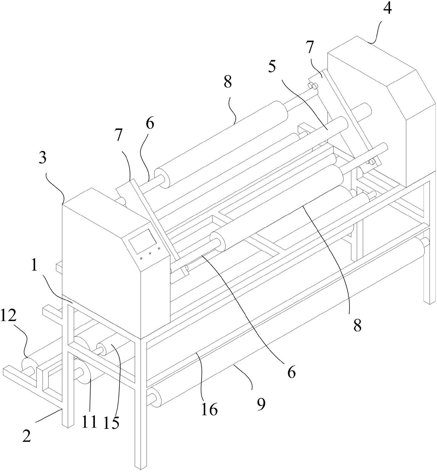 本实用新型属于铝板生产设备领域,尤其涉及一种新型铝板覆膜机。包括上支撑架和下支撑架,上支撑架上设置有放膜装置,包括设置在上支撑架一端的配电箱以及设置在上支撑架另一端的电机箱,配电箱和控制箱之间设置有放膜机构,放膜机构包括设置在配电箱和电机箱之间的转轴以及设置在转轴两侧的转动杆,转动杆上设置有膜卷;下支撑架上设置有覆膜装置,包括设置在下支撑架前侧的进板辊以及设置在下支撑架后侧的覆膜辊,覆膜辊下方设置有托辊,托辊下方后侧设置有出板辊。本实用新型结构简单、设计合理,操作便捷,不需对铝板进行油漆喷涂,只需按要求覆上相应的膜纸,即可达到需用要求,铝板外形美观,不仅工艺简单,而且环保无污染。