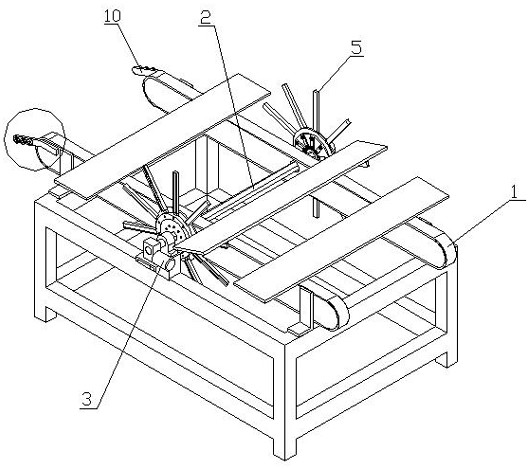 一种木地板翻板输送系统,它包括输送机(1)、主轴(2)、主轴驱动电机(3)、一对翻板组件和一对弧形下料杆(10),主轴(2)的两端分别通过轴承和轴承座安装在输送机(1)的机架上,主轴驱动电机(3)安装在输送机(1)的机架上,主轴驱动电机(3)的动力输出轴通过减速机与主轴(2)的一端传动相连,翻板组件包括固定盘(4)、一组翻板杆(5)、支撑盘(6)和压紧盘(7),固定盘(4)套装在主轴(2)上,固定盘(4)一侧环形均布开有一组限位槽(8);优点是:翻板速度快,减轻了工人的劳动强度。