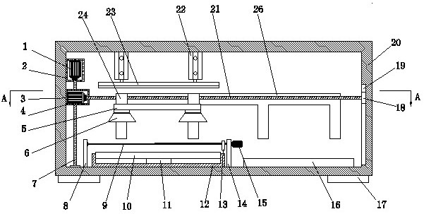 本实用新型公开了一种热压机,包括热压箱,热压箱内壁的底部固定安装有热压盒,热压盒的内部滑动连接有支撑板,热压箱内壁底部且靠近第一定位板的一端转动连接有第一丝杆,热压箱内壁的一侧固定安装有第一电机盒,第一电机盒的内部固定安装有第一伺服电机,第一伺服电机的输出端延伸至第一电机盒底部且与第一丝杆固定连接,第一丝杆的外侧螺纹连接有第三定位板,本实用新型所达到的有益效果是:本实用新型结构紧凑,操作简单便捷,实用性强,通过真空吸盘盒第三丝杆配合对装置完好自动上料,第三伺服电机与第二丝杆配合带动刮板移动,快速清理支撑板顶部热压产生的残屑,较传统热压机,极大的提升了装置实用性与使用效率。