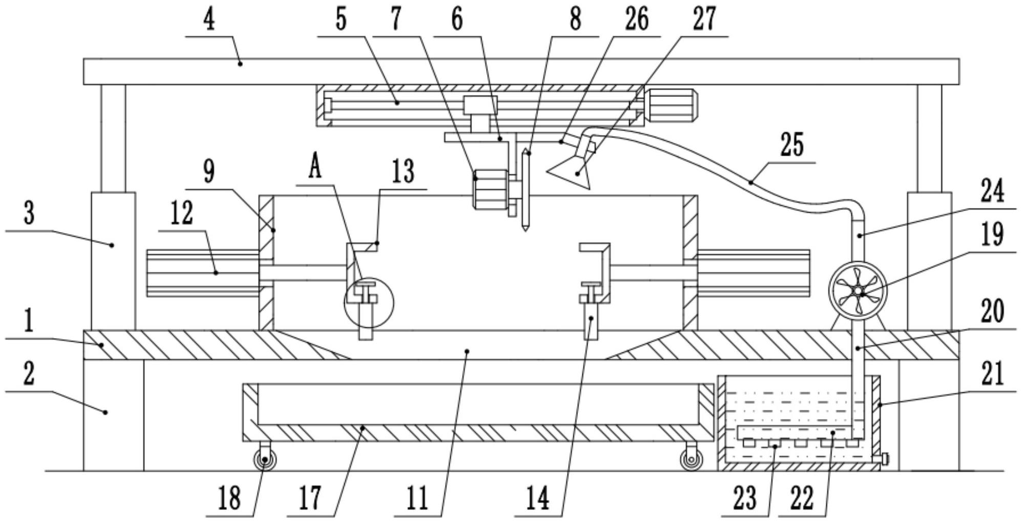 本实用新型涉及刨花板加工设备领域,具体涉及刨花板的锯切设备,其技术方案是:包括工作台,工作台底部四个拐角处均设置有支架,工作台顶部设置有第一电动升降杆,第一电动升降杆输出轴顶端固定安装有顶板,顶板底部通过调节组件连接有直角弯板,直角弯板侧部固定安装有驱动电机,驱动电机输出轴固定安装有用于对刨花板进行切割的刀盘,还包括用于防止碎屑溅射的防护组件以及用于清理粉尘的吸尘组件,本实用新型的有益效果是:可对刨花板被刀盘锯切过程中所产生的碎屑进行全方位遮挡防护,并收集,还可对粉尘进行及时吸收处理;可便于工作人员根据需求调整刨花板的切割位置;可用于锯切不同尺寸的刨花板,功能丰富,实用性强。