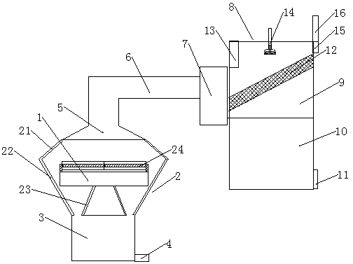 本实用新型涉及一种环保型板材加工除尘装置,它包括工作台,工作台的两侧均设置有输沉板,输沉板的下方共同设置有收集箱,工作台的上方设置有吸尘罩,吸尘罩的上方设置有吸尘管,吸尘管的另一端设置有风机,风机连接有布袋过滤器,布袋过滤器由导流仓和落灰仓组成,导流仓的顶部设置有喷淋头,喷淋头的上方连接有进水管,喷淋头的内部卡接有连接轴,连接轴的下方连接有风扇,喷淋头的底部和侧边均设置有喷淋口,导流仓的内壁上设置有自动脉冲清灰装置,导流仓的内部设置有导流板,导流仓的外部设置有过滤器,过滤器连接有排气口;本实用新型具有收集木屑、除尘效率高、使用寿命长的优点。