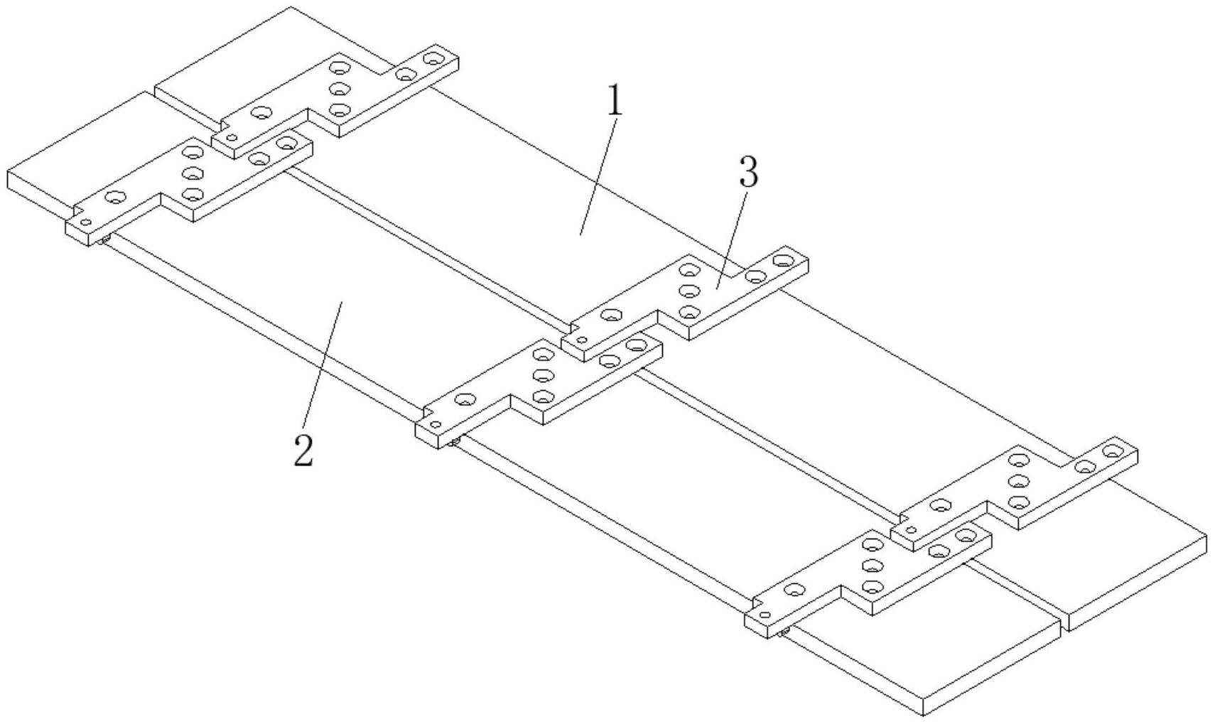 本实用新型公开了一种木制地板安装卡扣,涉及地板卡扣领域,解决了现有的实木地板通过普通金属卡扣进行拼装在长期的使用中易变形、异响、稳定性差的问题,现提出如下方案,其包括地板一、地板二,所述地板一与地板二之间设置有卡扣,所述卡扣的中部设置有中心块,所述中心块的上下两端分别固定连接有的上连接板与下连接板,所述下连接板的下端固定连接有装配块,所述中心块、上连接板、下连接板、装配块的表面均贯穿的开设有螺钉孔,且每个螺钉孔上均开设有倒角孔。本装置在具体的安装中,操作简单、方便,省时、省力,且安全可靠,主要用于阳台实木地板的安装,且安装的稳定性提高,在后期的使用中不容易发生变形以及异响的特点。