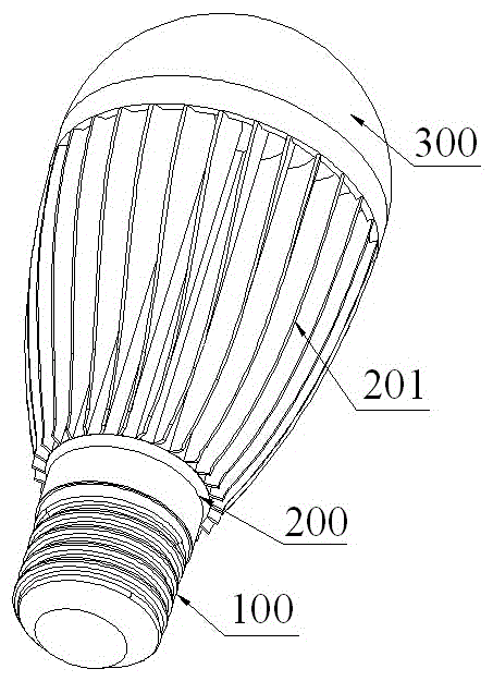 本实用新型公开一种LED灯泡,包括灯头螺帽、连接固定于灯头螺帽上端且内部设为空心腔体的灯体结构、紧贴固定于灯体结构上端面的LED光源结构、与灯体结构连接固定并罩设于LED光源结构上的透光罩、内置于空心腔体内并与LED光源结构连接的驱动装置;灯体结构外侧壁朝外延伸出若干散热翅片,灯体结构为一体成型结构并由导热金属制成;散热翅片上端位置与透光罩下端位置通过螺纹连接固定。
