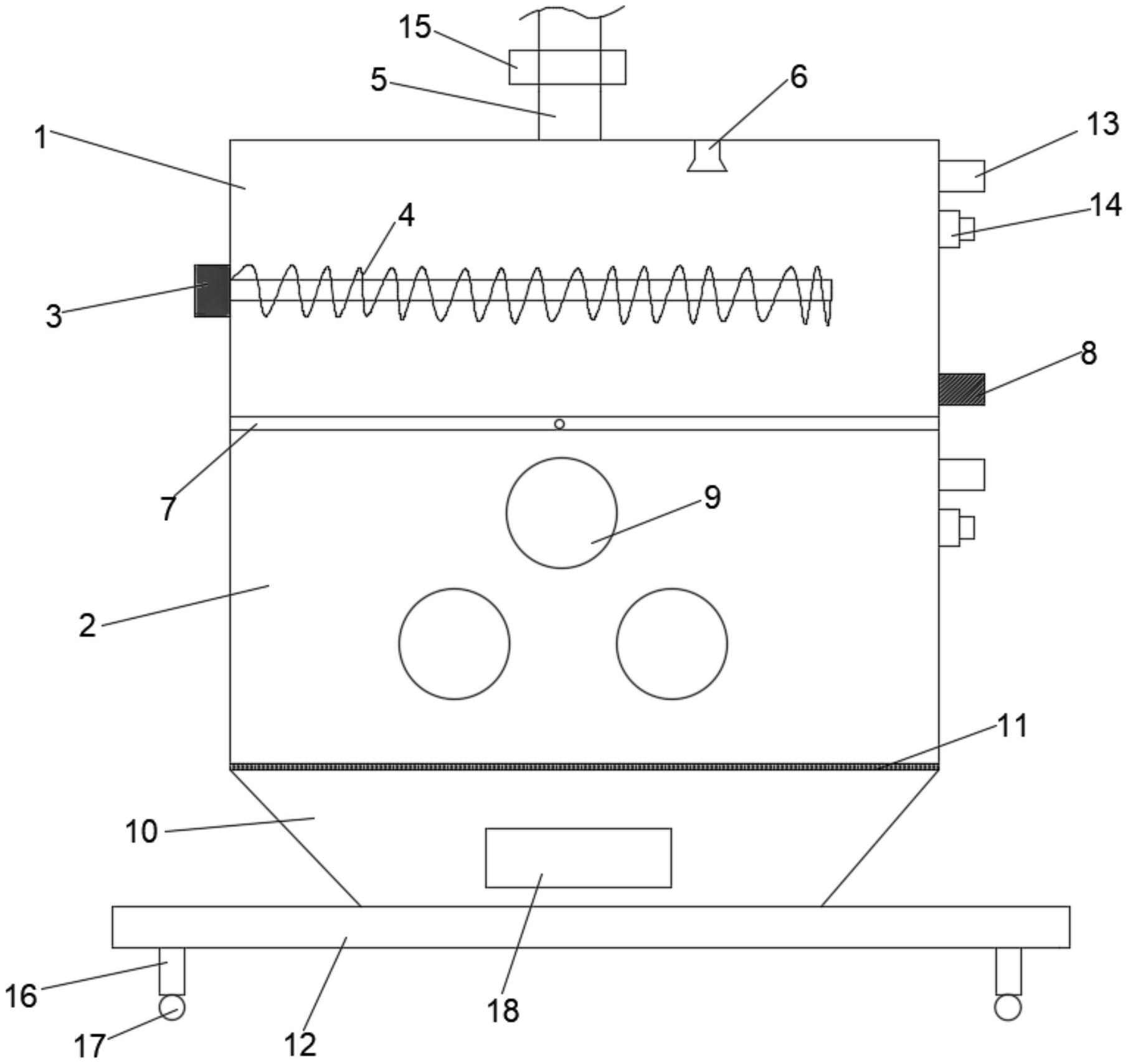 本实用新型公开了一种水蜜丸碾压装置,包括碾压机构,碾压机构从上至下依次包括第一碾压机构、第二碾压机构,第一碾压机构包括粉碎罐、设置在粉碎罐侧壁的第一电机、固定连接在第一电机输出轴上的螺旋刀片,粉碎罐上端设置有进料管、鼓风机,第二碾压机构包括碾压箱、以及设置在碾压箱内的碾压轮,粉碎罐与所述碾压箱的交接处设置有翻转板,粉碎罐的外侧壁设置有第二电机,第二电机与翻转板固定连接带动翻转板转动,碾压箱下端设置有出料仓,出料仓正面设置有箱门。本实用新型的水蜜丸研压装置研压效果好,采用二次粉碎大大提高了水蜜丸的粉碎效率,完美达到所需规格。