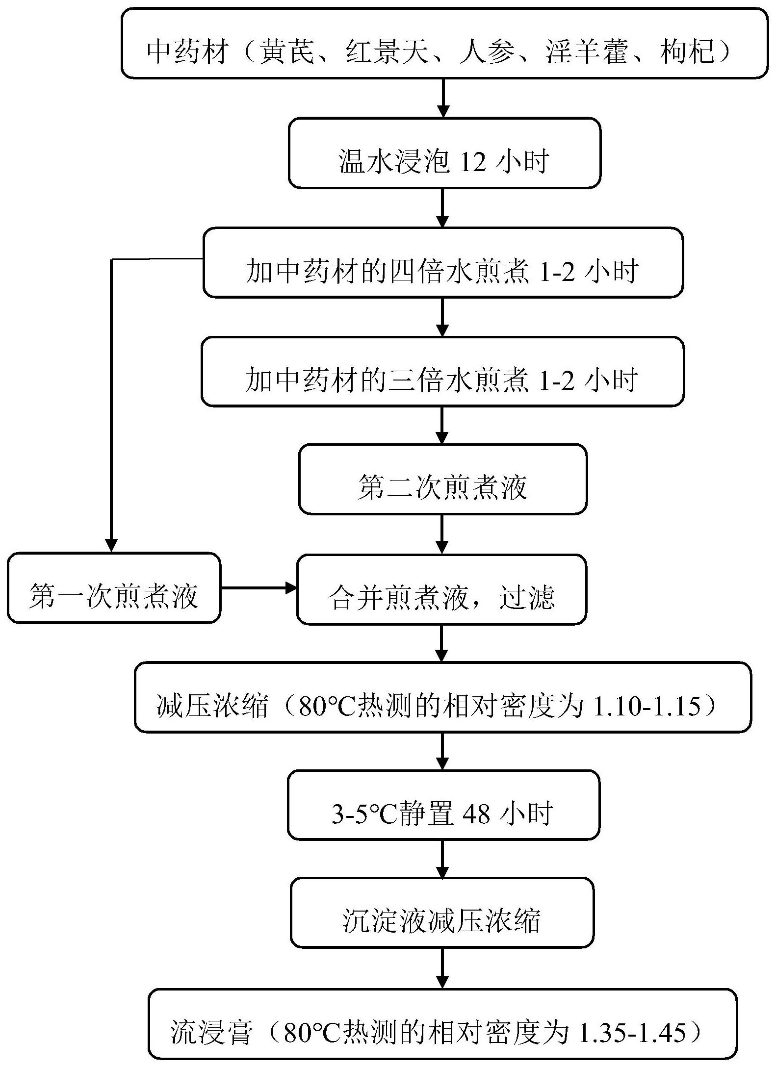 本发明公开了一种具有增强免疫力的胶囊及其制备方法。将黄芪、红景天、人参、淫羊藿、枸杞为原料,进行浸泡、煎煮、浓缩得到具有增强免疫力的流浸膏,向流浸膏中加入淀粉填充剂和海藻酸钠复合凝胶制成胶囊。与现有技术相比,将硬脂酸镁颗粒和辛癸酸甘油酯掺入海藻酸钠制成凝胶状,硬脂酸镁中的二价镁离子与海藻酸钠中的羧基发生离子络合,辛癸酸甘油酯提高胶囊软化性和溶解剂、稳定剂,海藻酸钠复合凝胶增加药物间粘性、均一性、流动性和可压性,还可以提高胶囊中药物崩解释放速率从而提高药物治疗的效果,制成胶囊后药物的整体性、均匀性和填充性更好。