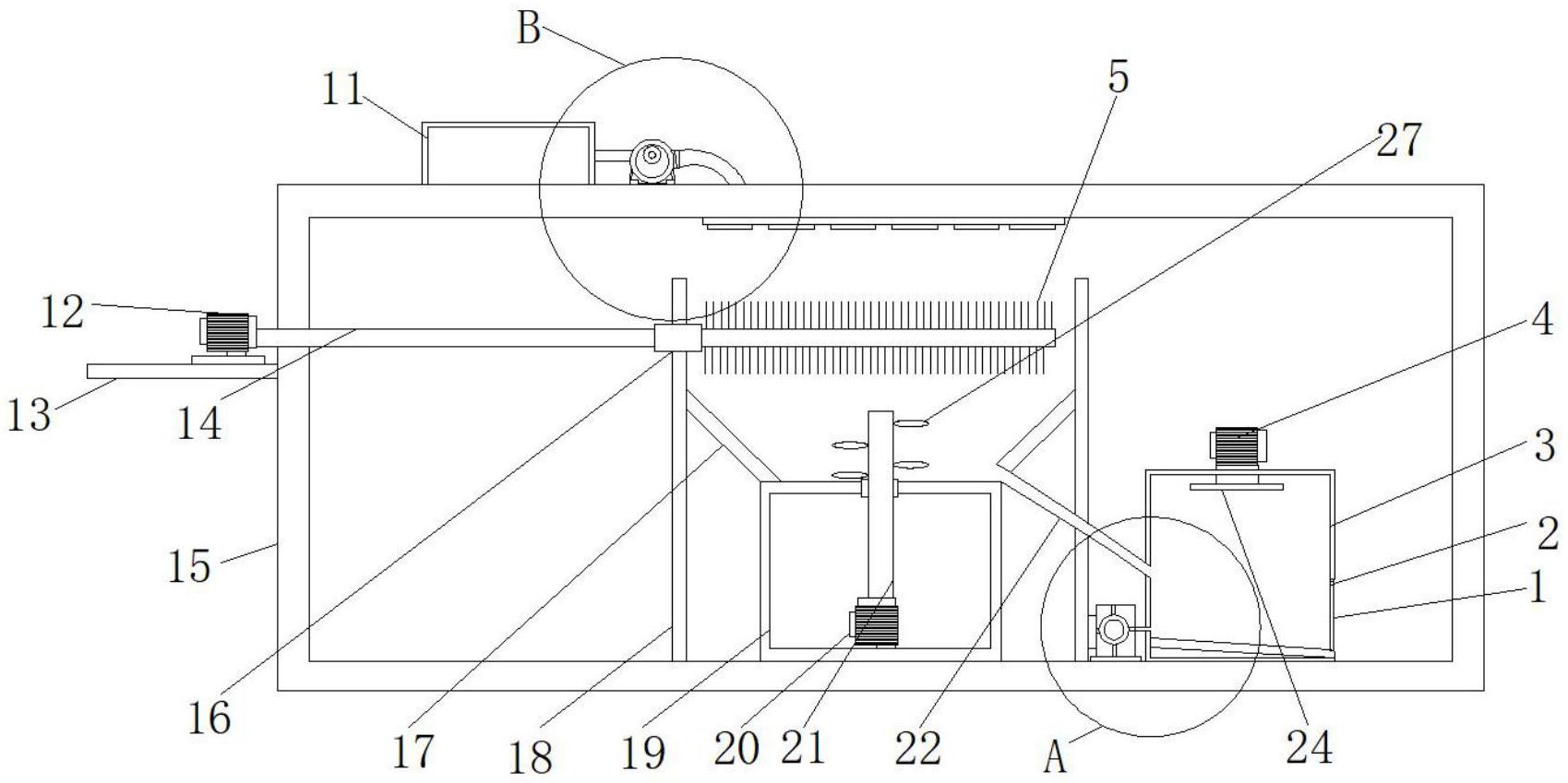 本实用新型公开了一种中药加工用清洗装置,包括烘干箱和机箱,所述机箱的左侧安装有横板,且横板的上方安装有第二电机,所述机箱的上方安装有水箱,且水箱的右侧安装有第三水管,所述第三水管的右侧安装有水泵,且水泵的右侧安装有第二水管,所述机箱的内部上端面安装有第一水管,且第一水管的外壁表面安装有喷头,所述喷头的下方安装有支撑架,且支撑架的内部安装有转轴,所述转轴的外壁表面安装有毛刷。本实用新型设置有水箱,设置水箱可以通过水泵和喷头对药物进行一个注水加湿效果,方便用户对药物进行混合清理,提高清洁程度,设置毛刷可以对药物进行一个搅拌刷动效果,进一步提高了对药物的清洗效率。