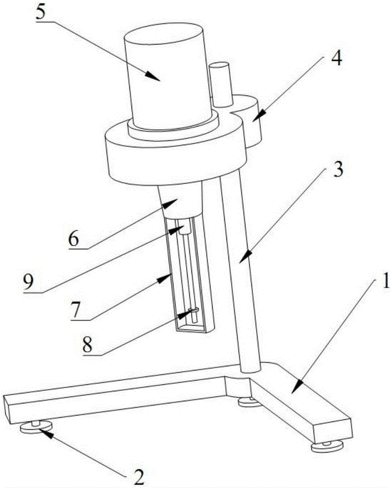 本实用新型公开了旋转式可拆卸粘度计,属于化妆品领域,主要解决目前现有的粘度计不能够根据产品的性能不同采用不同大小的旋转针,在检测产品过程中容易使得产品夹杂其他物质的问题,所述底座为L型结构设计,所述底座下端分布有调节垫片,所述立杆设在底座的直角处,所述立杆的一端与底座实现焊接固定,所述立杆的另一端设有电机座,所述电机座内设有容纳电机的圆形孔,所述转速输出头的下端设有容纳转子的螺纹孔,所述传感器通过夹头固定在转子内,本实用新型新颖独特,借助可拆卸的设计结构,解决了现有的粘度计不能够根据产品的性能不同采用不同大小的旋转针,在检测产品过程中容易使得产品夹杂其他物质的问题,测量精准度高。
