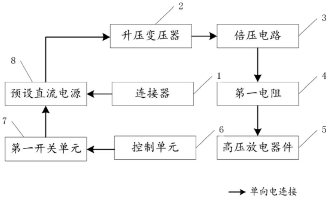 本申请提供一种高压产生电路,涉及电子电路技术领域,该高压产生电路包括连接器、升压变压器、倍压电路、第一电阻、高压放电器件、控制单元及第一开关单元;连接器的第一引脚连接预设直流电源的正极,连接器的第一引脚还连接升压变压器的初级侧的第一引脚;连接器的第二引脚接地;预设直流电源的负极连接升压变压器的初级侧的第二引脚;升压变压器的次级侧的第三引脚和第四引脚分别连接倍压电路的两个输入端,倍压电路的输出端通过第一电阻连接高压放电器件;控制单元的第一输出引脚连接第一开关单元的控制端,第一开关单元的输入端接地;第一开关单元的输出端与直流电源的负极连接。本申请解决了只能用交流电源为高压产生电路供电的问题。