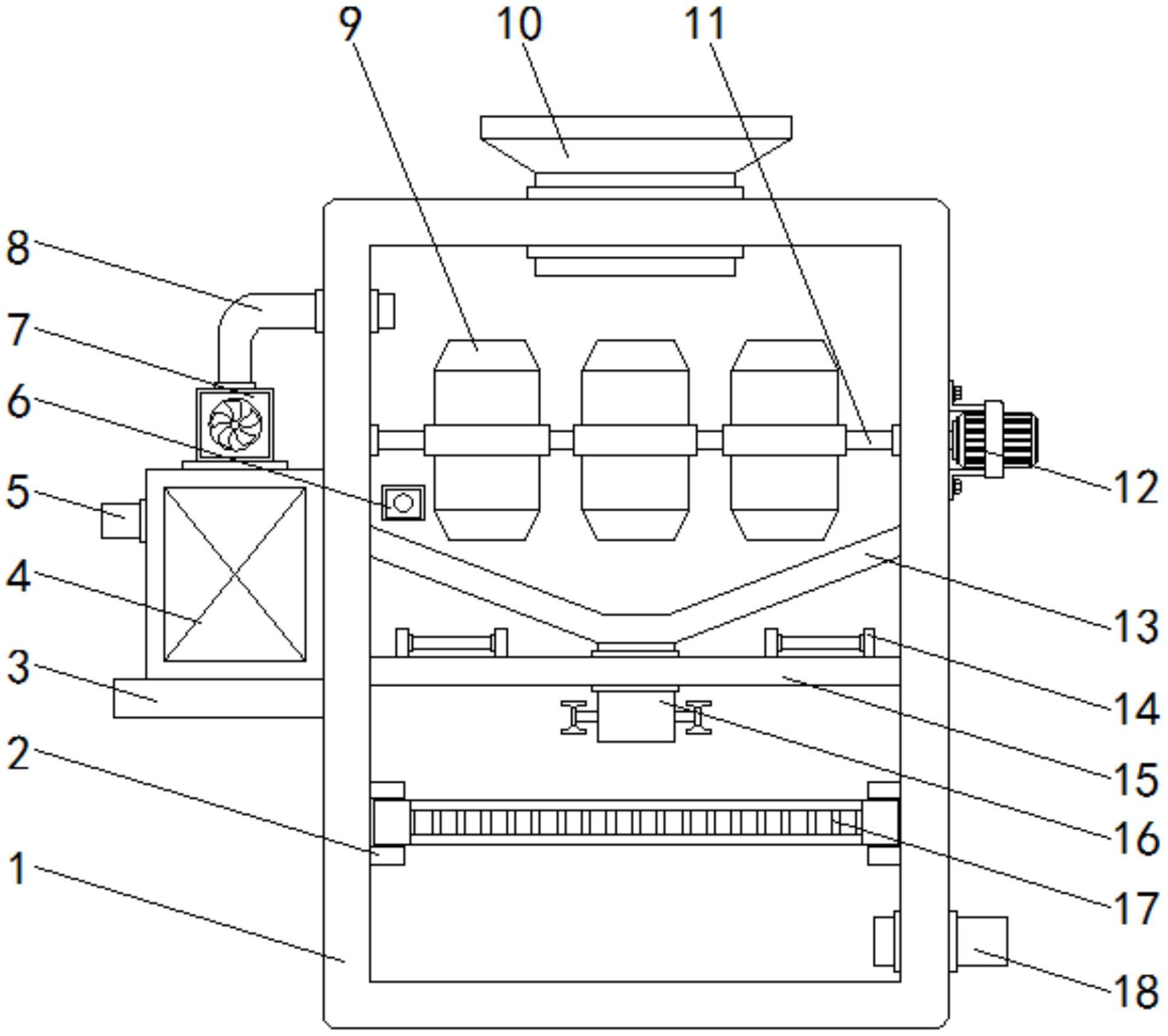 本实用新型涉及鱼皮胶原蛋白肽提取设备技术领域,且公开了一种罗非鱼皮提取大分子胶原蛋白肽的设备,包括设备本体,所述设备本体的左侧固定安装有固定板。该罗非鱼皮提取大分子胶原蛋白肽的设备,首先将罗非鱼皮碎片倒入设备本体内,并加入适量水,将驱动电机启动,使得罗非鱼皮与水混合,将加热丝通电,使得鱼皮与水的混合物升温,通过温度传感器和控制面板的配合对温度进行把控,到达适应值后,加入酶解剂进行酶解,接着将下料管上的控制阀打开,通过下料管使酶解后的浓缩液体下落,并由过滤板进行过滤提取,最后由出料管将胶原蛋白肽原液收集,整个收集提取过程采用机械自动化的方式来实现,可大大节省人工。