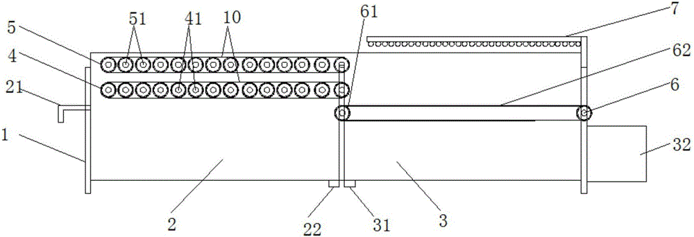 本实用新型公开了一种用于蜜饯生产过程中的清洗喷淋装置,包括清洗装置、喷淋装置和传送装置;清洗槽固定在支架上,第二驱动齿盘设置在第一驱动齿盘的上方,第一驱动齿盘与第一从动齿盘、第二驱动齿盘与第二从动齿盘均通过传动链条连接;滚轴通过转轴与第一从动齿盘连接,清洗轴通过转轴与第二从动齿盘连接;所述喷淋装置包括喷淋仓、喷淋支架、主管道和分管道;主管道固定在喷淋支架的内侧;分管道设置在主管道的框架之间,分管道的侧面均匀开设有喷水口;传送装置包括驱动轮、从动轮、传送带、驱动轴和从动轴,驱动轴和从动轴均设置在喷淋仓的内部上端;有效地增大清洗用水与蜜饯的冲击力和冲击接触面积,增强蜜饯的冲洗效果、提高蜜饯冲洗质量。