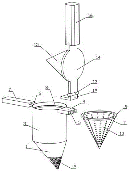 本实用新型公开了一种蛋液精细化过滤装置,包括蛋液斗,所述蛋液斗底部一侧设有若干A蛋液孔,所述蛋液斗连接有碎蛋桶,所述碎蛋桶位置对应A蛋液孔的一面连接有矩形块,所述矩形块内设有矩形孔,所述碎蛋桶位置对应矩形块的另一面连接有连接块,所述连接块连接有握把,所述碎蛋桶内侧连接有A挡圈,所述A挡圈匹配连接有B挡圈,所述B挡圈连接有锥形斗,所述锥形斗上密集设有B蛋液孔,所述矩形孔尺寸配合连接有L型块,所述L型块连接有转动轴,所述转动轴连接有压板,所述压板连接有锥形块,所述锥形块尺寸配合锥形斗,所述压板连接有压把。