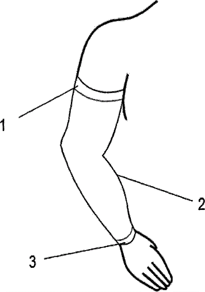 一种医用上肢压力带,是由医用上肢压力带袖口(1),医用上肢压力带袖筒(2),医用上肢压力带袖头(3)所组成,其特征是在上肢压力带袖口(1)处设置有一整圈防滑硅胶织物(4),在上肢压力带袖头(3)处设置有双层弹性结构,并且由袖头(3),袖筒(2),袖口(1)的依次方向,其袖筒(2)的尺寸由下而上呈直径渐大结构,而包裹压力由下而上依次渐小。乳癌症患者返家出院休养,无专业护理人员而无法持续物理治疗,使用本实用新型医用上肢压力带,采用模仿人体静脉系统压力模式,形成上肢包覆式渐近压力,可以解决持续治疗,连续解决乳癌症患者因淋巴水肿以致上肢严重肿胀问题。