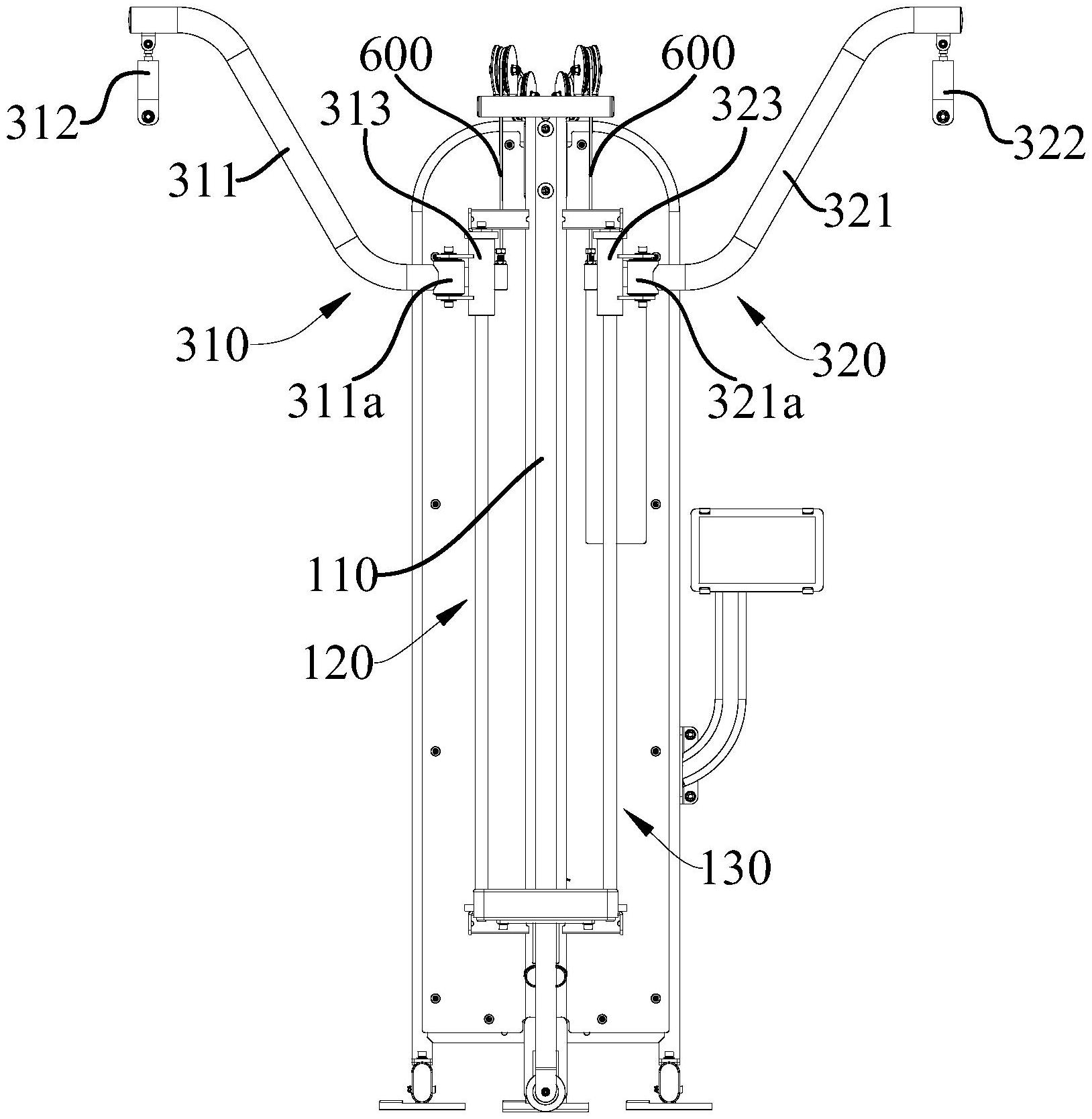 本申请公开了一种康复用下拉训练装置,包括:机架;阻力提供机构,其与机架连接;下拉机构,其通过钢丝绳与阻力提供机构相连;坐垫架,其位于下拉机构下方,坐垫架上设置有坐垫,坐垫架一端与机架转动连接;防转件,坐垫架和机架中任一个设置有防转件,防转件置入坐垫架和机架中另一个,以防止坐垫架相对于机架转动。使用者需要在坐垫上进行下拉训练时,将坐垫架转动至训练空间内,利用防转件来防止坐垫架相对于机架转动;使用者需要在轮椅进行下拉训练时,将防转件脱离坐垫架和机架中任一个,将坐垫架转动移出训练空间,轮椅可以推动至训练空间内,使用者可以根据训练需求,调整坐垫架的位置,在坐垫上进行下拉训练,或者在轮椅上进行下拉训练。