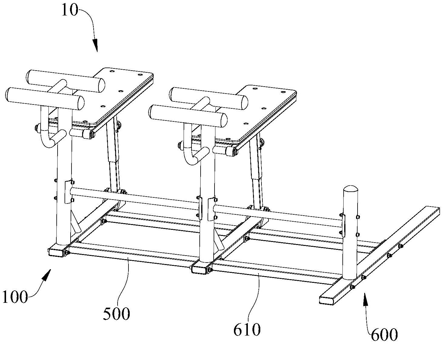 本申请公开了一种可调腹肌训练装置,该可调腹肌训练装置包括若干依次相连的训练单元,训练单元包括:固定架,其包括底架和立柱,立柱与底架固定连接;支撑机构,其包括支撑架和支撑垫,支撑垫设置在支撑架上,支撑架与立柱转动连接;调节机构,其包括第一连接管和第二连接管,第一连接管与支撑架转动连接,第二连接管与底架转动连接,第一连接管和第二连接管可调节固定位置地滑动套接;腿部支撑机构,其与立柱固定连接,腿部支撑机构包括撑腿管和压腿管,撑腿管和压腿管之间设置有供腿部穿过的间距。通过调节第一连接管与第二连接管的固定位置,来调节支撑机构的位置,从而满足多种训练需求。