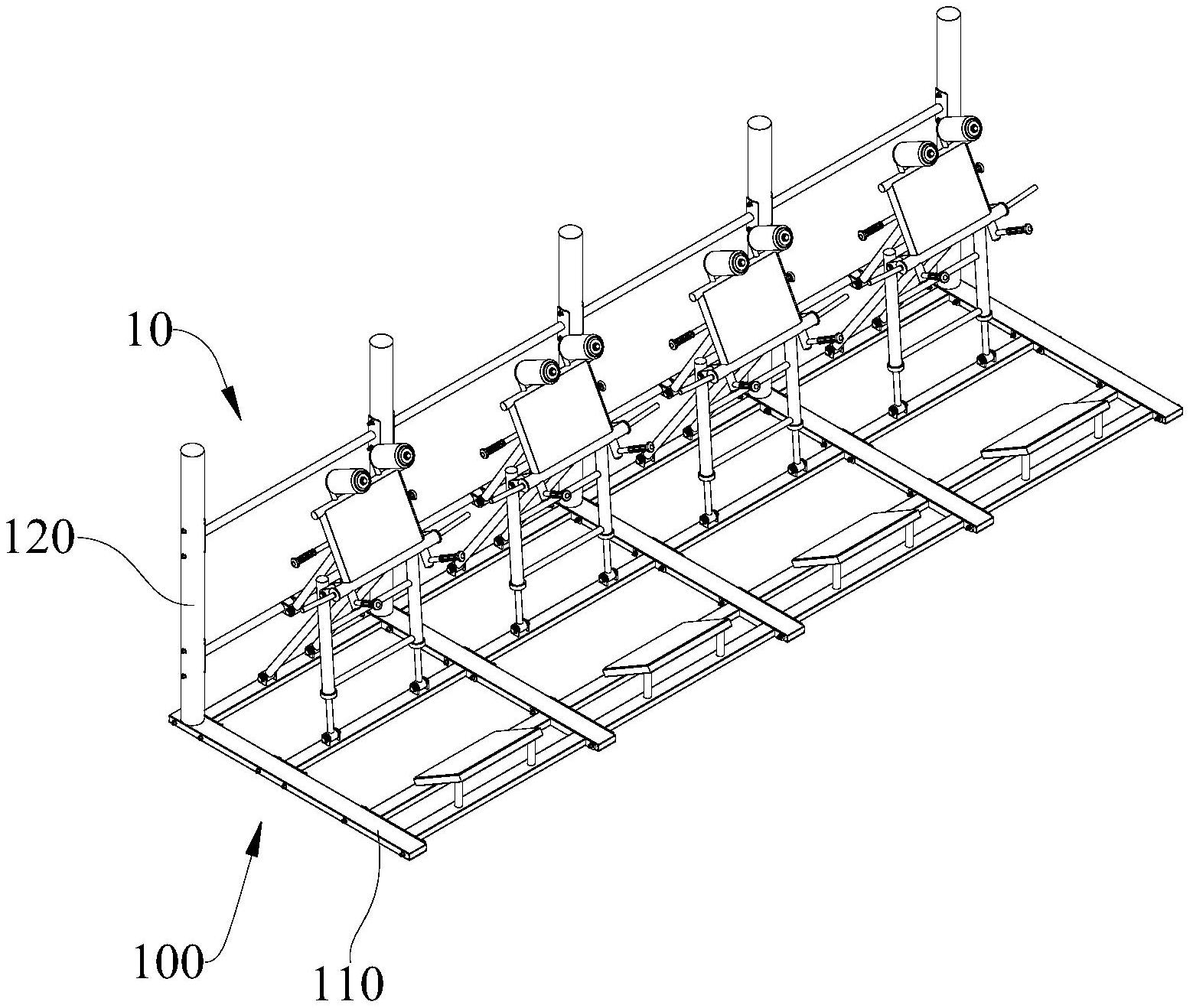 本申请公开了一种内置限位下肢蹬踏训练装置,该内置限位下肢蹬踏训练装置包括若干依次相连的训练单元,训练单元包括:固定架,其包括底架和立柱,立柱与底架固定连接;躯干支撑机构,其包括支撑架和支撑板,支撑板与支撑架固定连接,支撑架分别转动连接有第一连接管和第二连接管,支撑架顶部固定连接有第一肩管和第二肩管,支撑架固定连接有铃片杆;限位机构,其包括相互套接的外管和内管,外管与支撑架转动连接,内管与固定架转动连接,内管固定连接有第一固定块,外管固定连接有限位顶板,外管内设置有弹簧,弹簧位于限位顶板与第一固定块之间。避免限位机构外露,提高了内置限位下肢蹬踏训练装置的安全性。