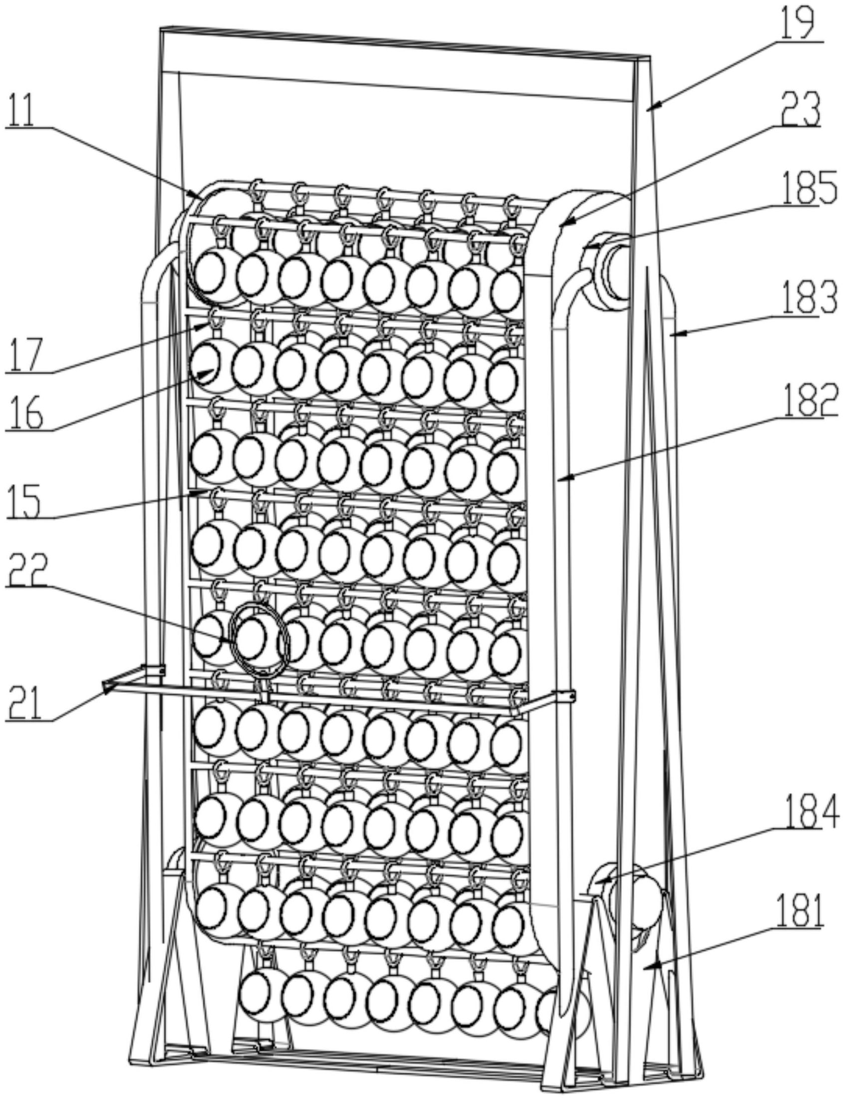 本实用新型公开一种养殖架,包括两根平行设置的环形传动件、与两根环形传动件中的至少一者相配合的旋转驱动件及若干根平行设于任意相邻两根环形传动件之间的悬挂杆;每根悬挂杆装有若干个养殖容器。当启动旋转驱动件时,旋转驱动件驱动两根环形传动件同步转动,带动全部悬挂杆上下移动,从而灵活改变悬挂杆上各养殖容器的位置,既方便在适当的高度处清理各养殖容器,又方便观赏及展示各养殖容器,还能确保各养殖容器均光照充足,因此本实用新型所提供的养殖架使用较方便。