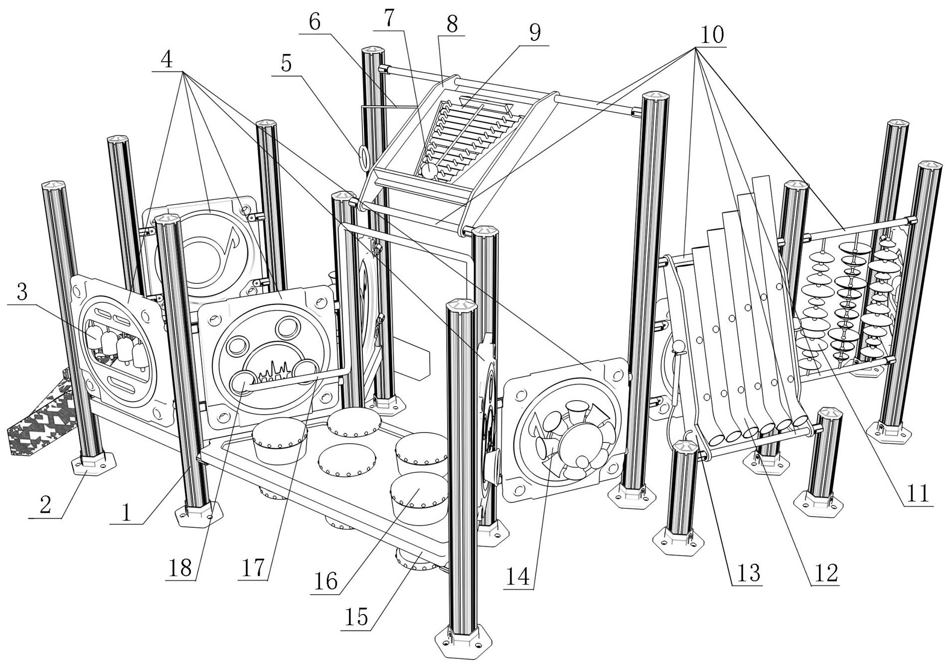 本实用新型涉及一种儿童益智乐器游乐设施,采用立柱、安装板和固定杆组成游戏架,在游戏架上安装多种乐器组成多个乐器单元,每个乐器单元采用不同的乐器,儿童通过玩乐认识乐器和不同乐器的声音,可多人共同玩乐,趣味性和益智功能好。