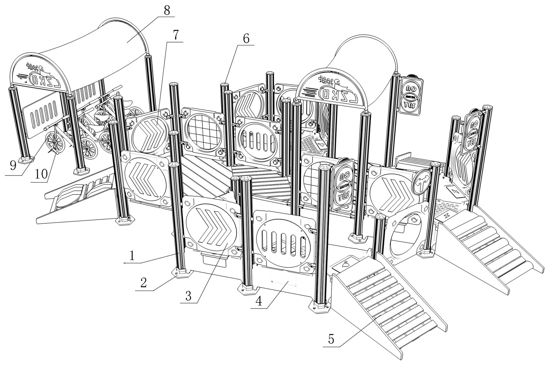 本实用新型涉及一种具有儿童交通安全教育功能的游乐设施,其特征是:包括立柱、围栏板、路面平台;由立柱、围栏板、路面平台组成模拟道路,在儿童游乐的过程中进行道路交通安全教育,具有直观、趣味性好、易理解、易记忆等优点。