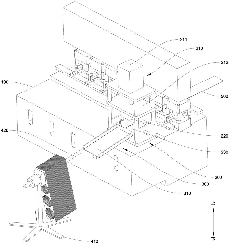 本实用新型公开了冲压边料回收装置,包括:基座,基座设有用于输送呈长条状的板料的送料区域和用于冲减板料的冲压区域;送料区域包括分别位于冲压区域两侧的原料输送区域和边料输送区域;压平抛光机构,设于边料输送区域,压平抛光机构包括第一压辊和第二压辊,第一压辊和第二压辊之间形成对板料进行压平抛光处理的压平抛光通道;下料机构,安装于基座,下料机构设于边料输送区域背离原料输送区域的一侧,下料机构用于输送板料。第一压辊和第二压辊配合对板料冲压后形成的边料进行压平和抛光处理,便于边料的后续使用,提高边料的利用率,另外,下料机构能够输出处理后的边料,避免堵塞压平抛光通道。