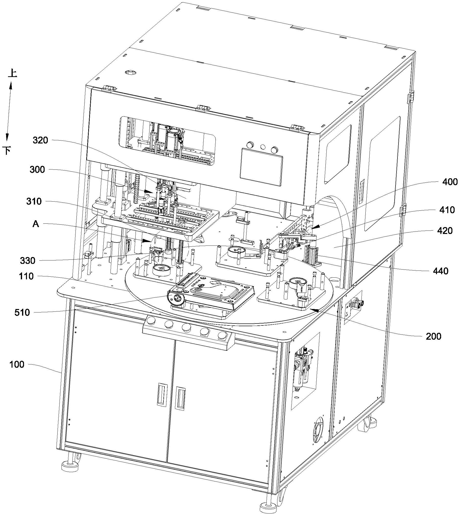 本实用新型公开了便携炉炉头和阀门自动组装机,包括:基座,转动安装有转盘;至少四个定位模块,沿转盘的周向均布,定位模块设有用于定位炉头的第一定位组件、用于定位阀门的第二定位组件和用于定位与炉头和阀门连接的底壳的第三定位组件;第一螺钉组装模块,安装于基座并位于转盘的上方,第一螺钉组装模块用于组装炉头和底壳;第二螺钉组装模块,安装于基座并位于转盘的外侧,第二螺钉组装模块用于组装阀门和底壳。将炉头、阀门和底壳依次放至定位模块进行定位,通过转盘对定位模块变位,第一螺钉组装模块从转盘的上方自动完成炉头与底壳的装配,第二螺钉组装模块从转盘的外侧自动完成阀门与底壳的装配,装配更为便捷,有效提高装配效率。