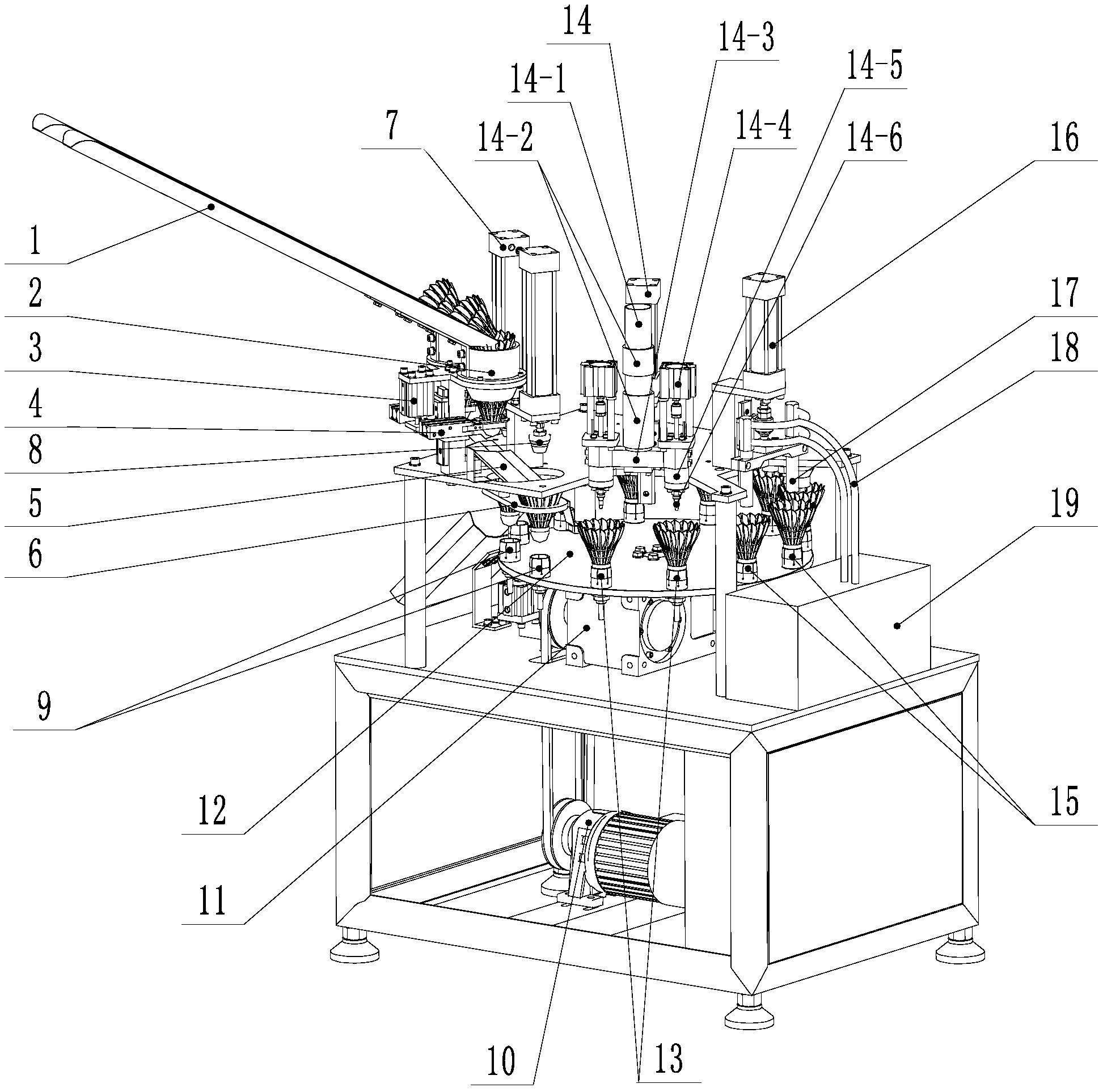 本实用新型涉及一种羽毛球用热熔胶增重机,包括转盘和依次设于转盘的上料单元、注胶单元、平压冷却单元、风扇冷却单元和下料单元,转盘用于承载多个羽毛球并旋转;上料单元用于将羽毛球上料于所述转盘;注胶单元用于将热熔胶注射于所述转盘上的羽毛球球芯处;平压冷却单元通过单元内的平压冷却头下压并冷却羽毛球球芯中的热熔胶;风扇冷却单元通过单元内的冷却风扇对经过压平、固化操作后的热熔胶进行再次冷却;下料单元用于将采用热熔胶增重并冷却后的羽毛球从所述转盘上下料。本实用新型的优点是能够实现熔胶、定量注胶、降温平压同步进行,减少了羽毛球制作工艺的工序以及用工数量。