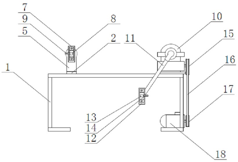 本实用新型公开了一种拉力器弹力软管弹力疲劳测试器,包括一机架,所述机架上设置有一对间距分离布置的定拉杆和动拉杆,所述动拉杆设置于一旋转杆的其中一端上,所述旋转杆的另一端设置于一驱动其旋转的动力机构上,所述定拉杆位于所述动拉杆旋转的圆周轨迹平面上。本实用新型采用一定拉杆和一动拉杆来模拟两只手从两端分别抓牢一个拉力器的握柄,然而让旋转杆带动动拉杆以其为半径转起来,模拟出拉力器的拉伸动作,转一周即为拉伸一次。接着多次试验得出一分钟旋转杆能够转动几圈,然后只要得到从起始到弹力软管崩断的测试总时间,用这个测试总时间去乘以一分钟的转动圈数,即可以得到该批次弹力软管的拉伸疲劳性能。