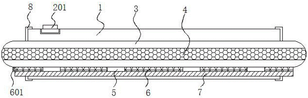 本实用新型公开了一种救生圈配套用本安型防爆圈灯,属于救生圈技术领域,包括救生圈,所述救生圈外侧壁套接有防爆玻璃管,所述防爆玻璃管内部安装有灯条,所述防爆玻璃管底部粘接有供电盒,所述供电盒套接在救生圈外侧壁,所述供电盒内部开设有电池槽且电池槽为多个,所述电池槽电流输出端与灯条电流输入端电连接,所述供电盒底部粘接有泡沫板,其使用过程中灯条一直置于防爆玻璃管的内部,防爆玻璃管为防爆玻璃制成,具有很好的耐冲击防爆性,受冲击破损后不易被贯穿,碎片不会脱落,即使在灯条发生短路爆炸等情况下也可以避免对救生圈造成损坏,保证救生圈正常使用,提高使用的安全性。