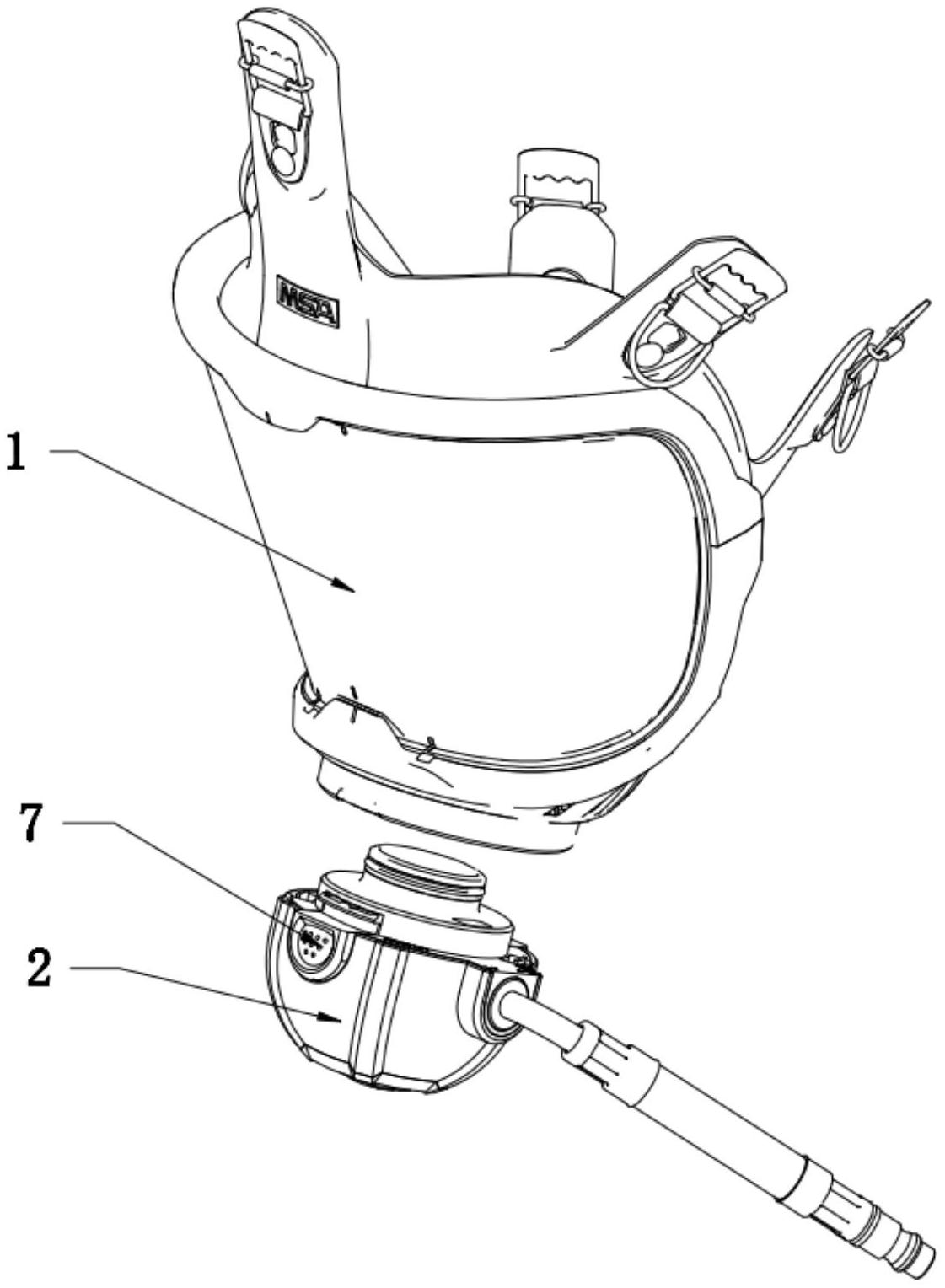 本实用新型属于阀门连接技术领域,具体为一种用于供气阀和全面罩的连接结构,包括全面罩和供气阀,所述全面罩的下侧设置有与供气阀相适配的全面罩接口,所述全面罩接口的内部下侧边缘处开设有连接凹槽,所述供气阀的左右侧壁均滑动插接有滑杆,所述滑杆位于供气阀外部的一端设置有按钮,所述按钮的内腔设置有弹簧,所述弹簧的另一端与供气阀的外壁连接,所述按钮的上端设置有连接扣,所述供气阀的外壁上侧设置有凸缘,所述连接扣位于凸缘的下侧。本方案结构简单,连接牢固可靠,拆卸方便。在使用者的头部的转动时,供气阀在全面罩上也相应的转动,从而提高了使用者的佩戴舒适性,避免管道折弯造成供气不畅的情况出现。