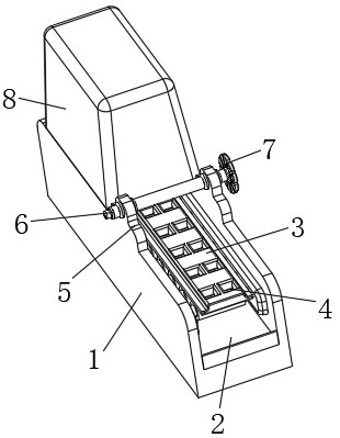 本实用新型公开了一种酸奶桶装机清洗结构,包括底座,所述底座的顶部固定安装有主控台,所述底座的内壁上固定安装有两组位置相对的链条盒,且两组链条盒之间固定套装有旋辊,所述底座的内侧装配有位于旋辊顶部的轨道板,所述底座的顶部固定安装有两组侧座,两组所述侧座之间装配有管体;该酸奶桶装机清洗结构,通过底座顶部管体的设置,能够通过其底部的喷孔的设置对轨道板及限位槽内侧上所遗留的奶渣进行清洗,配合上轴承套与旋柄的设置,能够通过旋动管体来增加其喷洒的范围与水流所喷溅的角度,从而达到对轨道板和限位槽上奶渣进行高效清洗的效果,解决了现有装置需要对轨道板进行拆卸清洗操作繁琐且效率较低的问题。