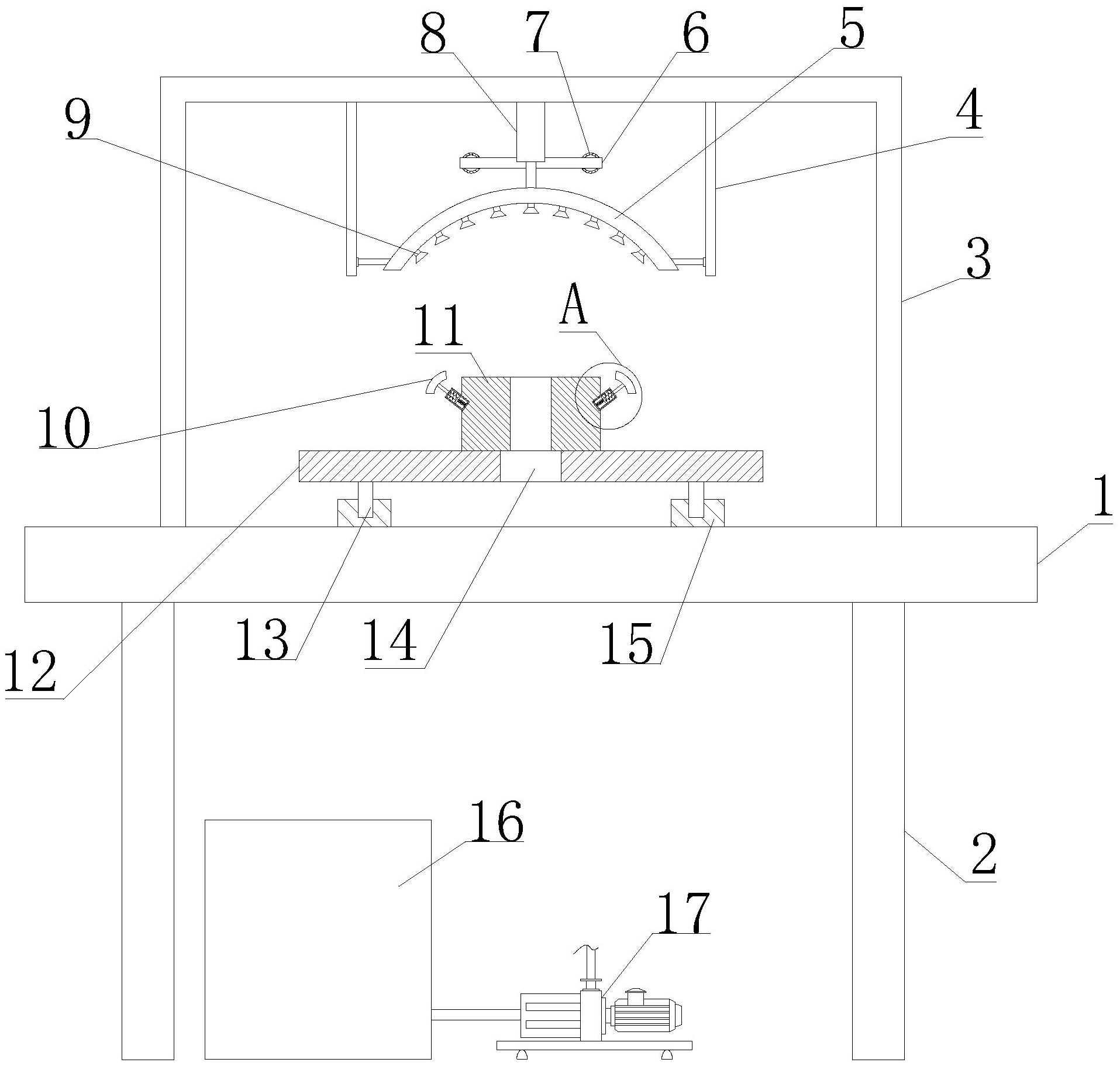 一种安全帽生产用原料喷涂装置,包括工作台、连接杆、喷料管、放置块、放置板、储料箱和输料泵;工作台的下端面设有多组支撑柱,工作台上设有安装架和多组并排分布的固定板;喷料管的投影为扇环,喷料管的内端面均匀设有多组喷头,喷料管通过输料泵连接储料箱,喷料管上对称设有两组转轴;两组转轴分别通过连接杆连接安装架;安装架上设有用于驱动喷料管以转轴为中心做周期性弧线运行的驱动组件;放置板滑动连接固定板;放置板上设有放置块设置在放置板的上端面,工作状态下,放置块位于喷料管的正下方,放置块上设有多组用于压紧待喷涂安全帽内壁的夹持头。本实用新型操作简单方便对待喷涂安全帽进行固定并能提高对其的喷涂质量。