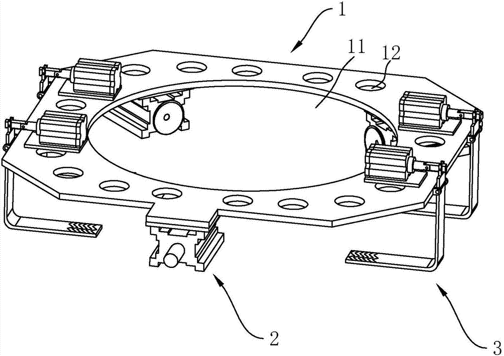本实用新型公开了一种用于注塑机机械手的安全帽抱件装置,其技术方案要点是包括框架盘,其连接注塑机机械手;数个吸附组件,所述数个吸附组件周向均匀设置于框架盘下方以用于对安全帽进行吸附;托持组件,所述托持组件设置于所述框架盘外侧,当所述框架盘处于水平状态时,所述托持组件翻转至安全帽下方以用于承托安全帽。通过设置的托持组件,减小运送安全帽时安全帽从注塑机机械手上脱落的概率。