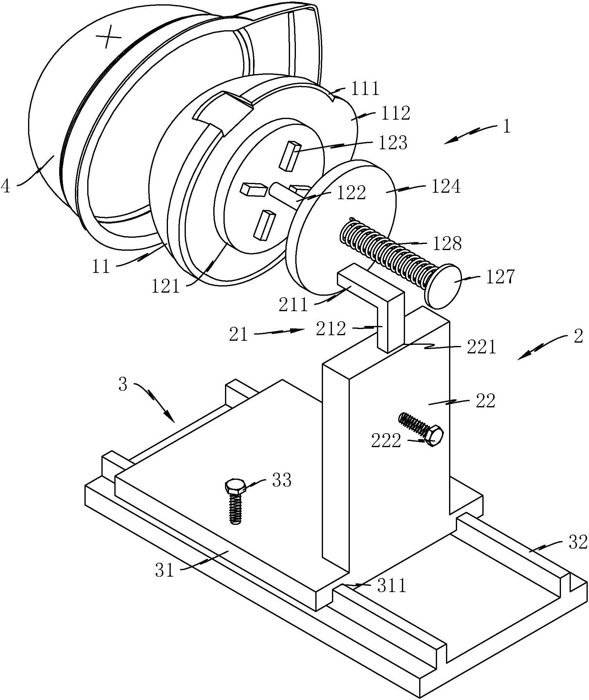 本实用新型公开了一种安全帽标签印染辅助装置,解决了更换安全帽印染位置时需要频繁改动定位装置的问题,其技术方案要点是包括定位装置、承载定位装置竖直滑动的升降装置以及支撑升降装置和定位装置的底座,所述定位装置包括支撑罩和承载支撑罩旋转的旋转组件,所述旋转组件包括固定盘和以所述固定盘中心为轴圆周运动以及沿轴向滑动的旋转盘,所述支撑罩固定于所述旋转盘上,所述固定盘与所述旋转盘相对的一面上设置有周向均匀分布的限位凹槽,所述旋转盘上设置有与所述限位凹槽相对应的限位凸块。能够方便改变安全帽的印染面,不需要频繁更换模具,提高了印染效率。
