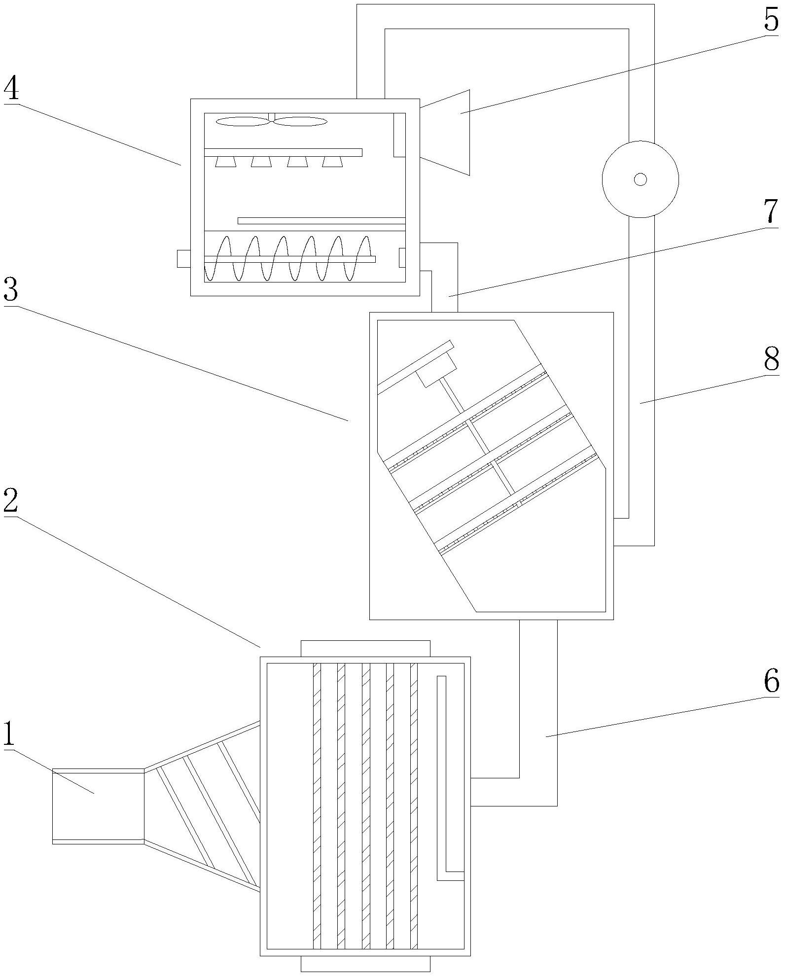 一种安全帽生产线废气处理系统,包括进气管、换热设备、第一净化设备、第二净化设备、出气管、第一连通管、第二连通管和第三连通管;进气管设置在换热设备的进气端;第一连通管连通换热设备和第一净化设备;第二连通管连通第一净化设备和第二净化设备;第三连通管连通第二净化设备和第一净化设备;出气管连通第二净化设备,内部设置有空气质量检测器。本实用新型设置废气通过进气管进入系统,接着经过换热设备,实现对废气资源的再利用,然后经过第一净化设备,多组过滤板对废气内的颗粒、杂物、异味进行过滤,最后经过第二净化设备,利用净化溶液对废气进行吸附,实现废气的净化,操作简单,实现了废气资源的再利用,废气处理效果好。